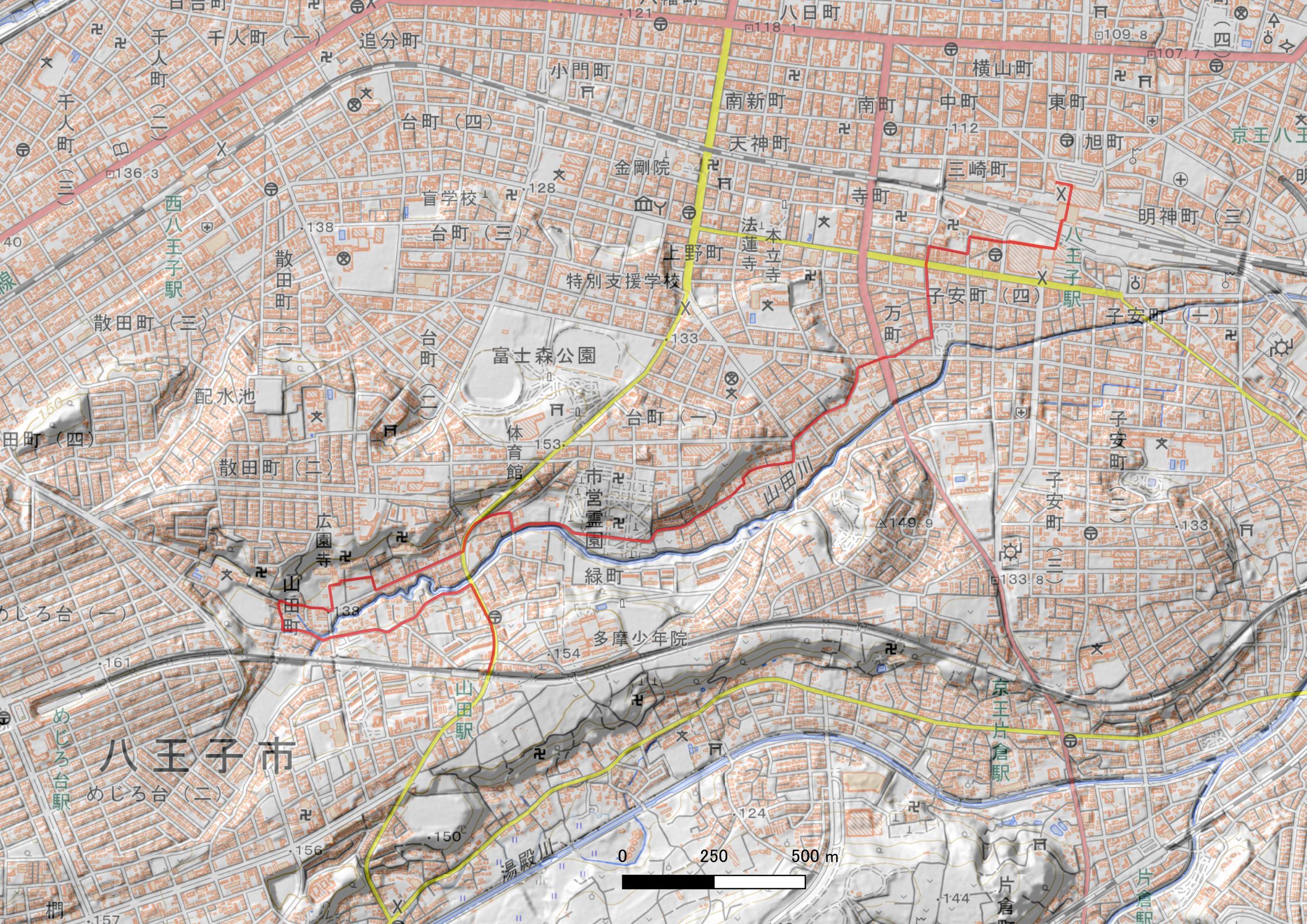散策コース:京王山田駅→山田川源流付近→広園寺→山田川沿い旧道→萬福寺→万町→ 子安町一興林寺→JR八王子駅