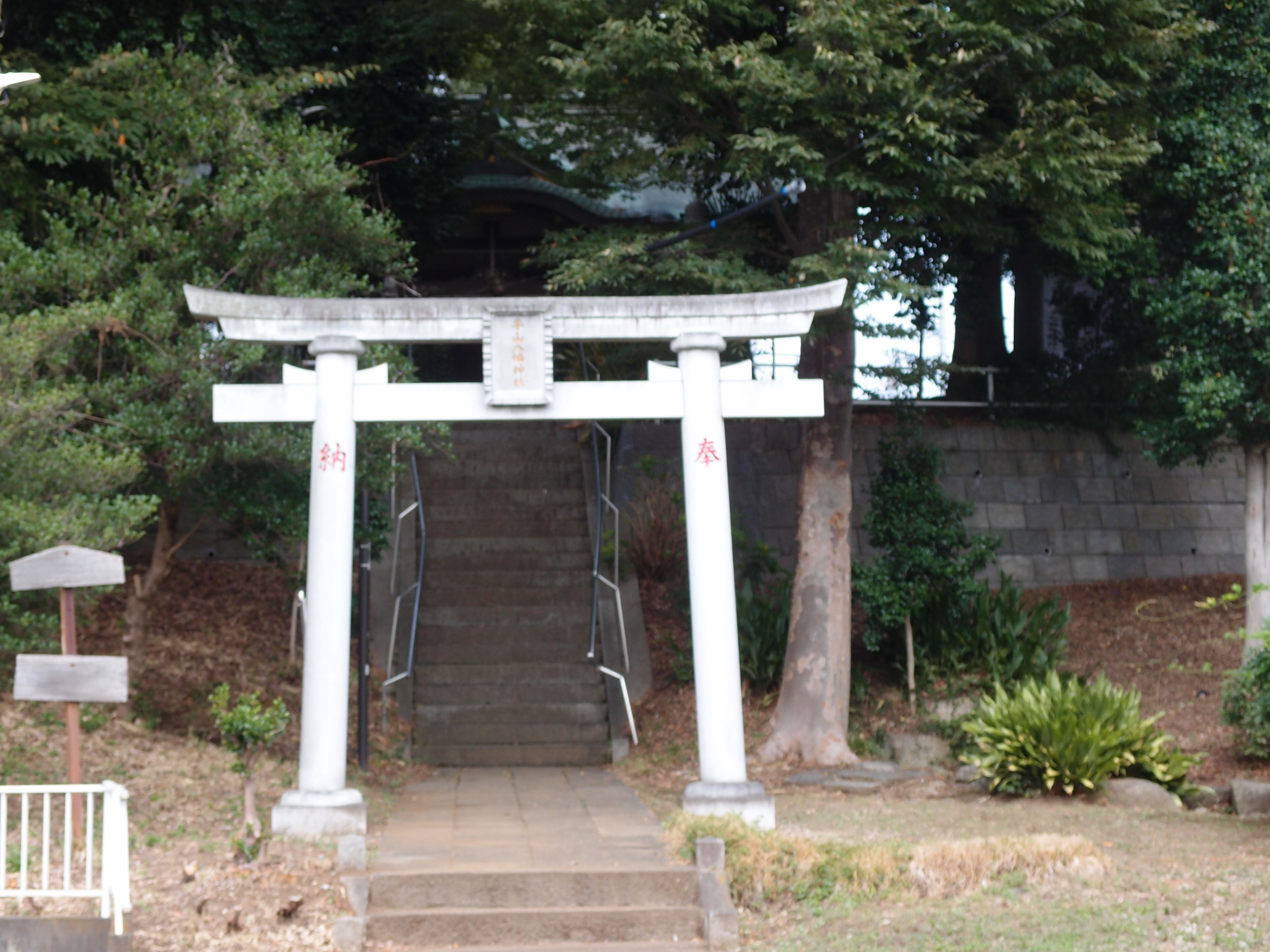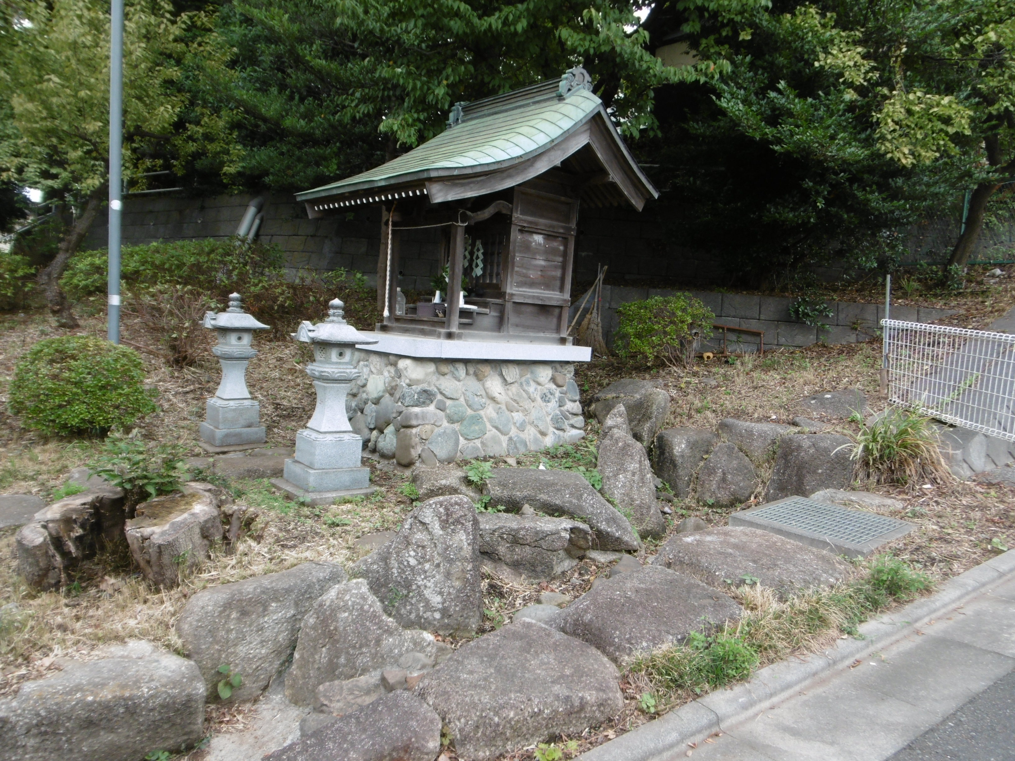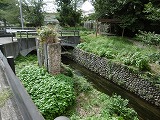 日野市立中央図書館下湧水は日野台地の崖線にある。図書館の裏の庭を突っ切って石段を下りたところに鳥居があり、その脇を湧水が流れている。