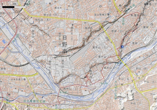 【地形と遺跡】 日野市は日野台と呼ばれる台地が広い面積を占め、南部は浅川による北側が高く南側が低い河岸段丘が発達している。最も高い台地は上位面でその下に下位面があり、更に低位面が認められる。下位面と低位面との境の崖線には湧水が見られる。