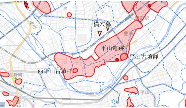 段丘の下位面には、縄文から中世まで各時代の平山遺跡があり、段丘崖の上には平山古墳群、西平山古墳群の古墳が分布している。また、上位面と下位面の境の崖には横穴墓も発見されている。