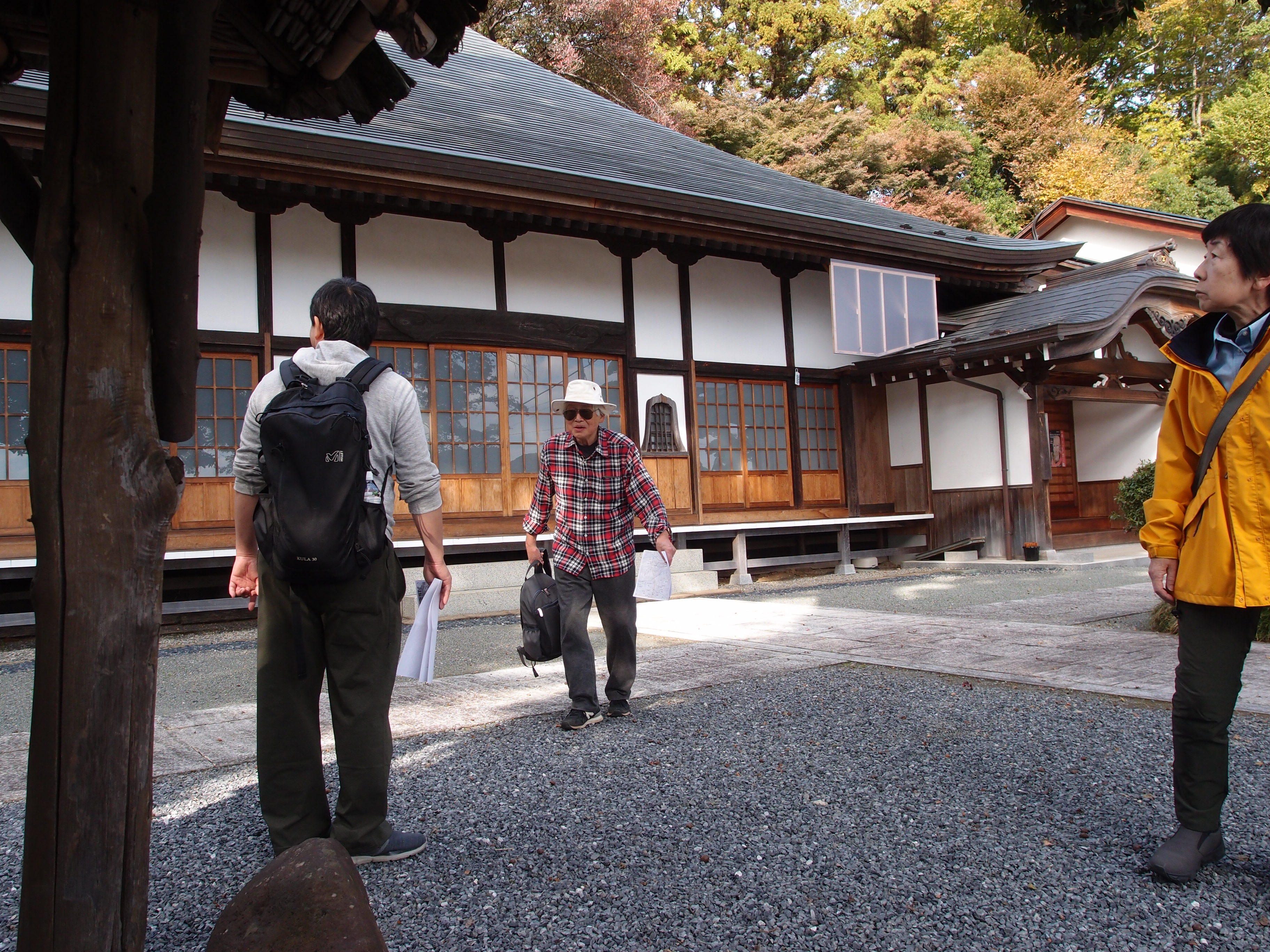 境内を散策していると、神社を守っている当番の方が扉を開けて中を見せてくれた。正面に弁天像が安置され室内も掃除がされて奇麗に保たれていた。話をうかがうと、神社の北側にはかつて3つの池があり、松姫が現在、信松院に保存されている舟を浮かべて遊んだことが伝えられているという。訪れる人と出会うことも少ないということで、帰りに私たち全員にお供えの紙パックのお酒と一ひねりの塩をいただいた。
