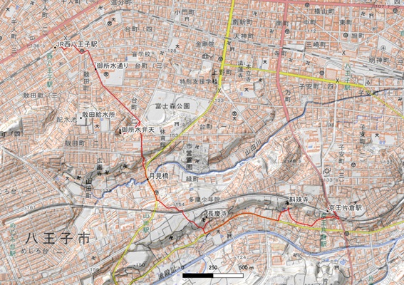 散策コース:京王片倉駅→斟珠寺・時田弁財天→長慶寺→京王山田駅→山田川→御所水弁天→御所水通り→JR西八王子駅