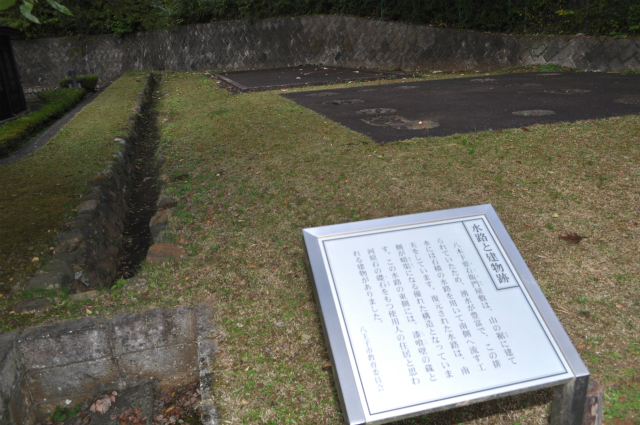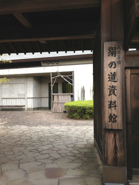 民家沿いの道を北に向かい5分ほど歩くと右手に絹の道資料館がある。入口の木造の門には「八王子市絹の道資料館」と墨書された木の看板が出迎えてくれる。資料館の敷地は、かつての鑓水の生糸商、八木要右衛門家屋敷跡で、資料館の建物も生糸商人屋敷の景観をイメージした造りとなっている。建物内部は絹の道と生糸商人の関係や製糸・養蚕に関する資料が展示されているほか、絹の道を歩く人の休憩所もある。入場は無料。建物の外の庭には、八木要右衛門家屋敷の遺構も残されており、山裾の湧水を引いた水路跡や絹の取引相手であった異人館の建物跡の礎石がある。