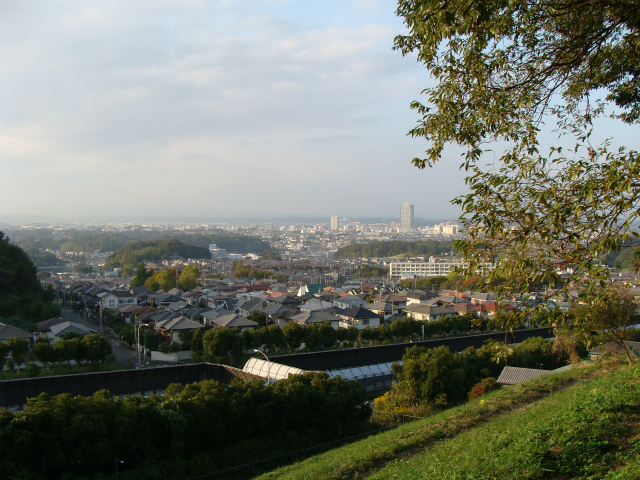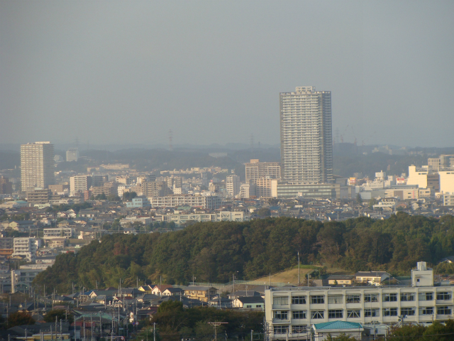 地図を眺め、石段に向かい左側の道を進むことにし、山頂の北側に出ると、一気に視界が開け、眼下には新興住宅地が広がり、その先には八王子駅南口に聳える高層ビルが目を引く。