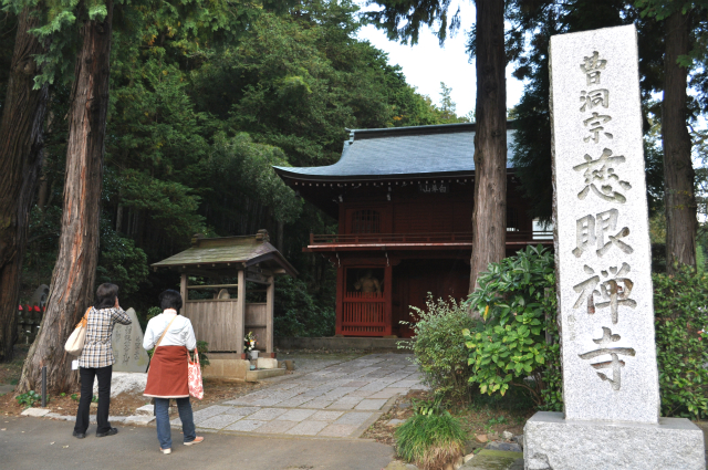 入口の案内板から山門までは150mほどあったであろうか。山門前の駐車場には大きな石柱に曹洞宗慈限禅寺と掘られていた。その奥に朱塗りの山門が見え、境内へと続く。本堂は工事中であったが、敷地は広く庫裏の裏には十三重の石の塔が建っていた。朱塗りの山門はの上は鐘楼を兼ねているとのこと。