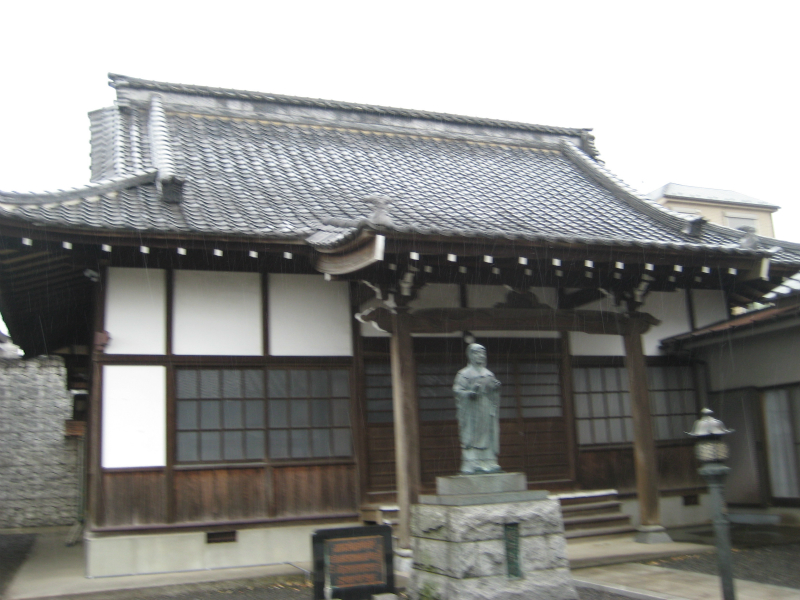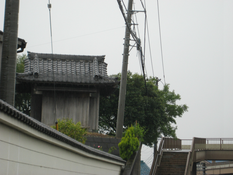 お茶屋の松の前の道を西に向かい、工場の北の道に出たところが、旧谷地川が多摩川に合流する地点だそうで、今も水路のような小川がある。この道路沿いに西に向かうことにしたが、道路の南側には、日野用水が流れていたので、用水沿いの道を歩くことにした。水路の周辺は住宅や畑がしばらく続き、歩き始めに立ち寄った東福寺の前の北に向かう道を多摩大橋の手前で渡り、大規模な下水処理場の前を通って、JR八高線の下をくぐった。このあたりから、南側の丘陵が高さを増し、北側斜面は広葉樹の樹木に覆われている。案内人のFさんによれば、丘陵上に古い道もあるそうだが、雨で足元が不安なので、そのまま丘陵下の道を西に向かう。北側の広い空き地が切れたところに平の集落が現れ、集落の北のやや高いところに寺の屋根が見える。