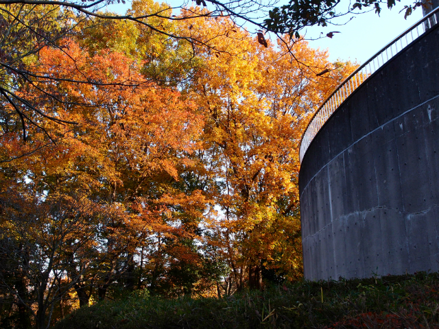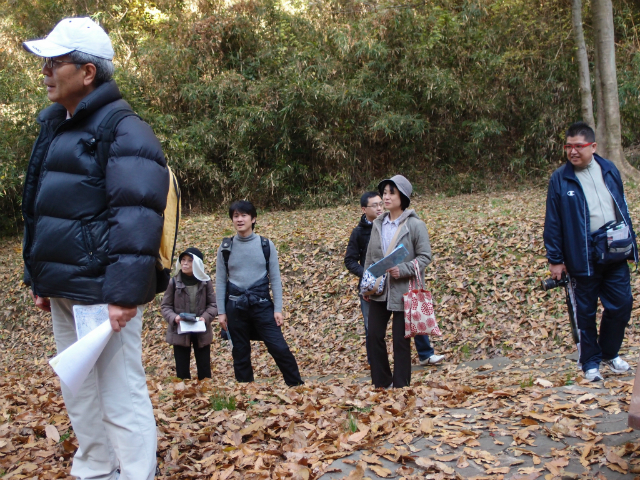 首都大学東京の敷地には、シラカシやスダジイなど常緑樹林が繁茂する 開発前の自然も保存されていて、緑地内には3つの池があり、イモリやカエル、スッポン、コイ、カメ等が生息しているという。構内の南斜面の緑地南に抜けたところは、斜面の裾野を色どる紅葉が夕日に映えて鮮やかだった。