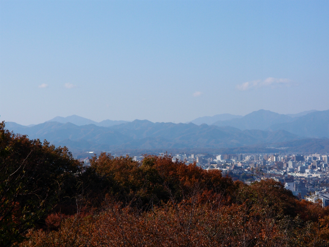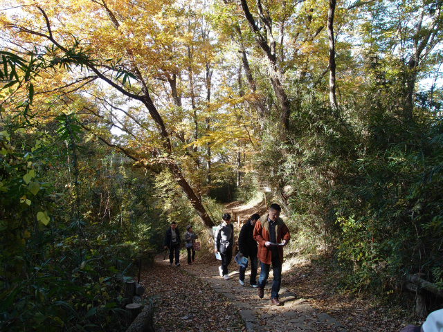 尾根に近いところで、長泉寺尾根の道との分岐があり、やがて尾根道に出た。目的地は尾根道を東に向かうのだが、西側に休憩所があり、ここで地元のTkさんが合流し参加者は12名となった。一休みして、先ほど来た山頂の尾根を東に向かう。霧降の道との合流地点を過ぎ、北に延びる長泉寺尾根の山頂部に北側を展望できる広場があった。秋晴れで空気が澄んでいたこともあり、西に連なる関東山地の山の峰が一望でき、眼下には八王子から日野にかけての街並みが開けていた。