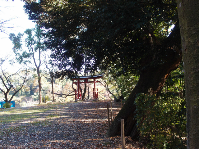 神社南側境内入口に建つ赤鳥居を潜り、谷沿いの道にでると開発前の風景が残っていて、東側の谷には丈の高い皇帝ダリアが咲いていた。