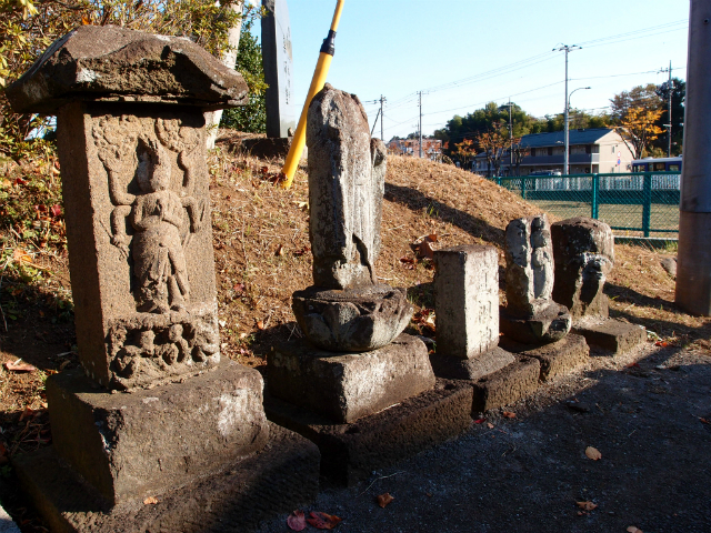 永林寺の総門を出て正面の道を南に下り、野猿街道から別れて大栗川の谷を西に向かう柚木街道をから、大栗川の対岸の丘陵にある首都大学東京を目指す。大栗川に架かる富士見橋からは富士山が見える(写真では中央やや左寄りに薄くシルエットが写っている)。 大栗川の南の丘陵の東北部には、富士見台公園があり、その入口に地蔵尊などの野仏が祀られていた。