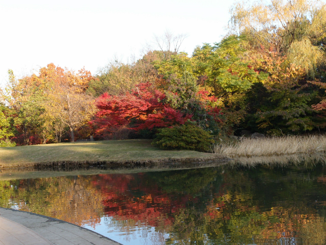 この通りを中程まで歩いた時、南側の11号館の前に広がる池と紅葉が目に入ったので、池に映る対岸の紅葉を望みながらデッキに腰を下ろし一休みした。