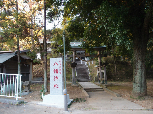 八幡神社本殿に向かい、境内右手には樹齢600年以上とも言われる巨木のオオツクバネガシがあり、市指定の天然記念物になっている。この木は、明治13年の火災により枯死したかと思われていたが、しばらくして再生したため地元の人は「不死身のアカガシ」として大切にしているという。また、神社入口の西には末広稲荷大明神も隣接していて、この付近だけが開発前の面影を残している。