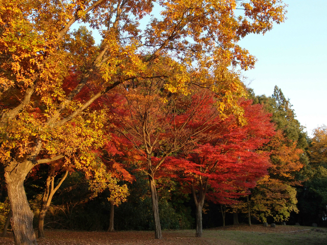 展望の広場から尾根沿いの道を東へ向かう。北へ伸びる笹尾根の先に休憩所があり、そこだけ楓の赤が鮮やかだった。ここの休憩所の説明板には、この付近に生息する鳥や昆虫が紹介されていた。