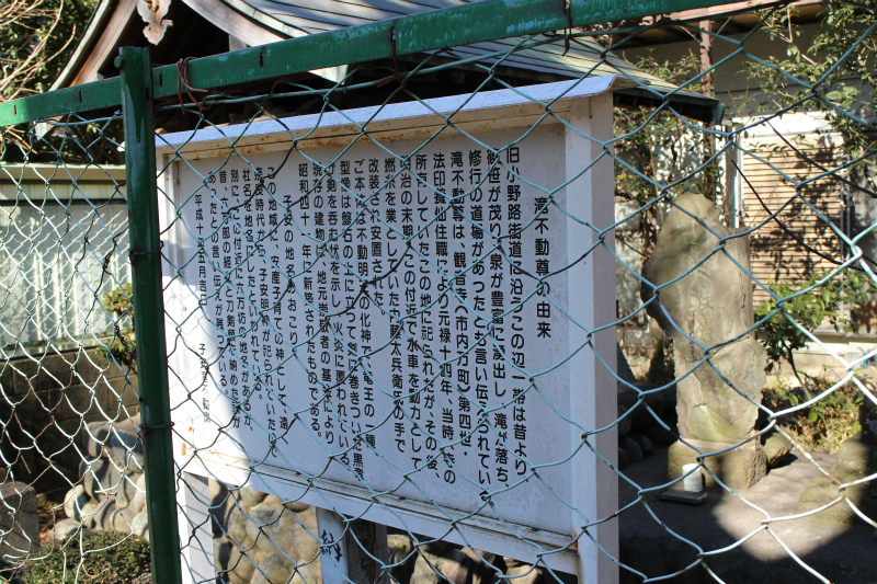 古い地形図を見ると、八王子の市街地を南東方向に離れるにつれ、山田川の支流の谷が扇状地の先端を削り、野猿街道の北側は水田になっている。扇端部分で扇状地の伏流水が滝となって流れ落ちていたようで、駅から700mほどの野猿街道の旧道沿いの一段低いところに、滝不動という祠が残っている。明治から昭和初期の地形図にはこの水の力を利用したのであろう、この付近に水車の記号が見られる。祠の傍の説明板には、本尊について不動尊の化身である竜王であるとの説明がある。 滝不動を後に、野猿街道お旧道を北野向うと、一旦現在の野猿街道に出るが、再び左手に旧道の入口が見えてくる。この旧道を入ると民家の前に大きな地蔵尊が祀られている。更に旧道を進むと下り坂となり、右手の台地の切れるところに横浜線と京王線の線路が並ぶ踏切が見える。踏切の手前の右手の上り坂の道の中腹にも地蔵尊が見える。
