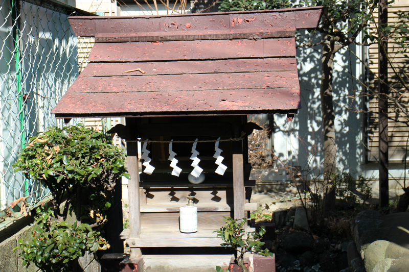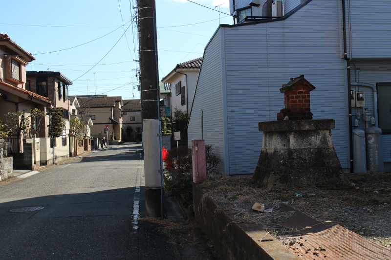 この辺りは新しい住宅が立ち並んでいるが、橋脚跡の正面の道を右へ進み、中央線の手前で再び右に曲がり、中央線沿いのかつての線路敷辺りの道を東向かう。しばらく歩くと、国道16号の八王子バイパスに着き当たる。八王子バイパス沿いに南に向かえば、野猿街道の交差部に戻るが、最初の信号交差点を右に曲がり、住宅の中の道を左に折れて南に向かうと住宅の中の駐車場の一角に煉瓦造りの小さな祠が見える。稲荷を祀ったものと思われるが、現在は祠だけになっている。煉瓦造りの祠というのも通常はなかなか見られないから、これも近くにあった煉瓦工場の痕跡ではないかと思われる。
