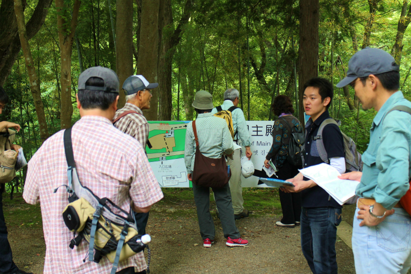 柵門台から山頂に向かう道は、急峻で石段等の整備されていないので、疲れが見え始めた参加者にはかなりハードな登りとなった。急な上り坂を過ぎ、一息ついたところで北側に伸びる平らな尾根が目に入る。尾根の先端には高丸と書かれた標識があった。ここは要害地区の入口に当たり、搦め手口と大手道が交わる守りの要となるから、北側の搦め手口へ下る尾根には数段の腰曲輪もあるという。