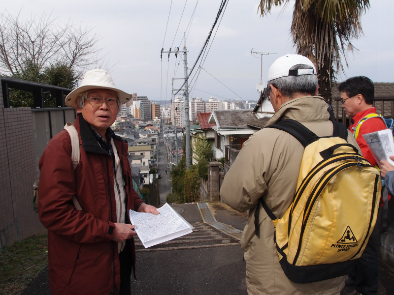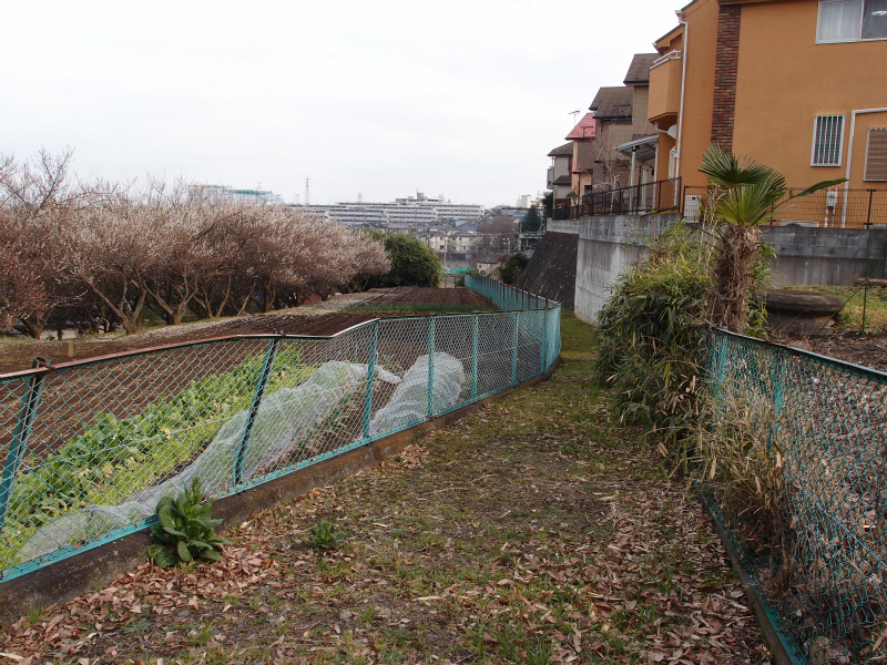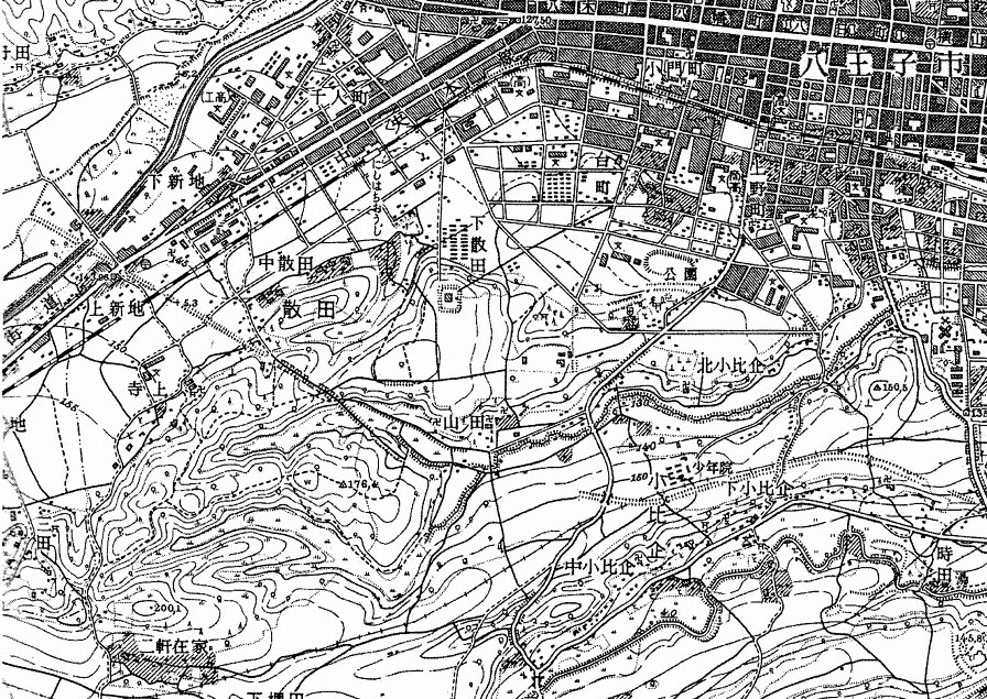 御陵線の分岐部からめじろ台団地の中の京王線と並行する南斜面の道を西に向かう。団地開発前の地形図を見ると、現在のめじろ台駅の南東に谷があったことが分かるが、直線の道路はかつての地形を想像だにさせてくれない。台地上の広い平らな面は、尾根の高い部分を削り、谷を埋めて人工的に作られた地形ということが改めてわかる。こうした開発は昭和30年代後半から多摩地域の各地で行われてきたが、この団地はその先駆けでもあった。