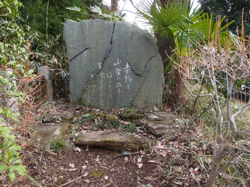 多摩の横山徒歩ゆか遣らむ」の歌碑がある。この道を下ったところには殿上人を祀ったという高宰神社や蛙合戦で有名な真覚寺があり、周囲の住宅街とは異なる空間となっている。