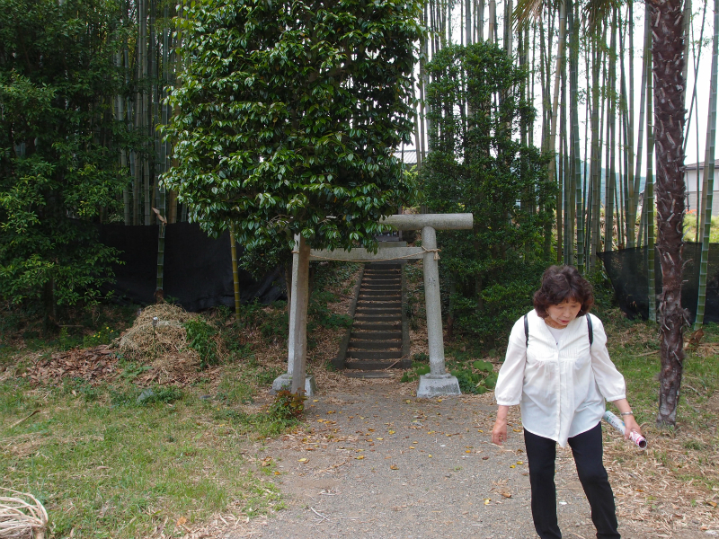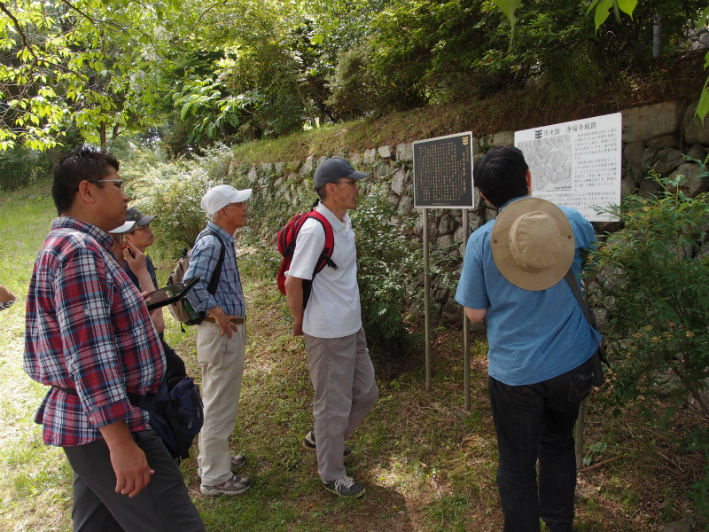 寺の説明を受け、浄福寺城の登り口をうかがうと、墓地の端の登り口まで案内してくれた。城跡へ向かう道はつづら折りのかなりの急坂だったことと、山頂まで行く時間が無いこともあって、途中まで登ってみることにした。道沿いには、観音の石仏があり、この道を登りながら三十三観音の霊場を巡ることができるとのことである。下で待つという数名を残し、中腹まで登って見たが、すぐ下に北浅川の流れとやや広い河岸段丘の平地が見え、築城の場所としても敵地であるように思えた。