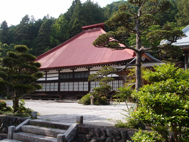 次のバス停は狐塚右手の斜面には畑が広がり、山の中腹に赤い屋根のお寺が見える。臨済宗南禅寺派の古寺で、至徳元(1384)年に山田広園寺の末寺として起山されたと伝えられる興慶寺である。