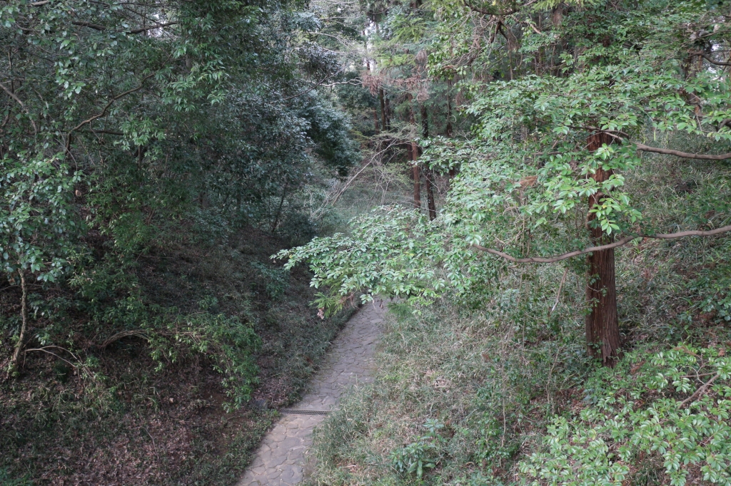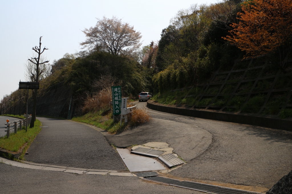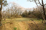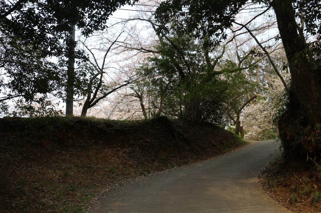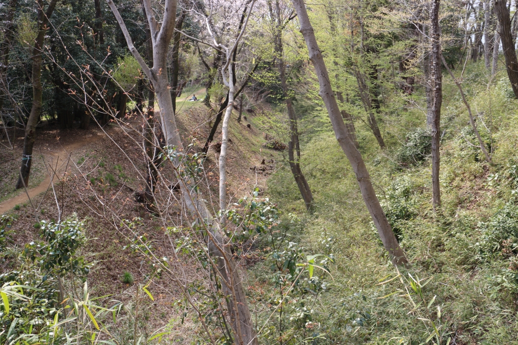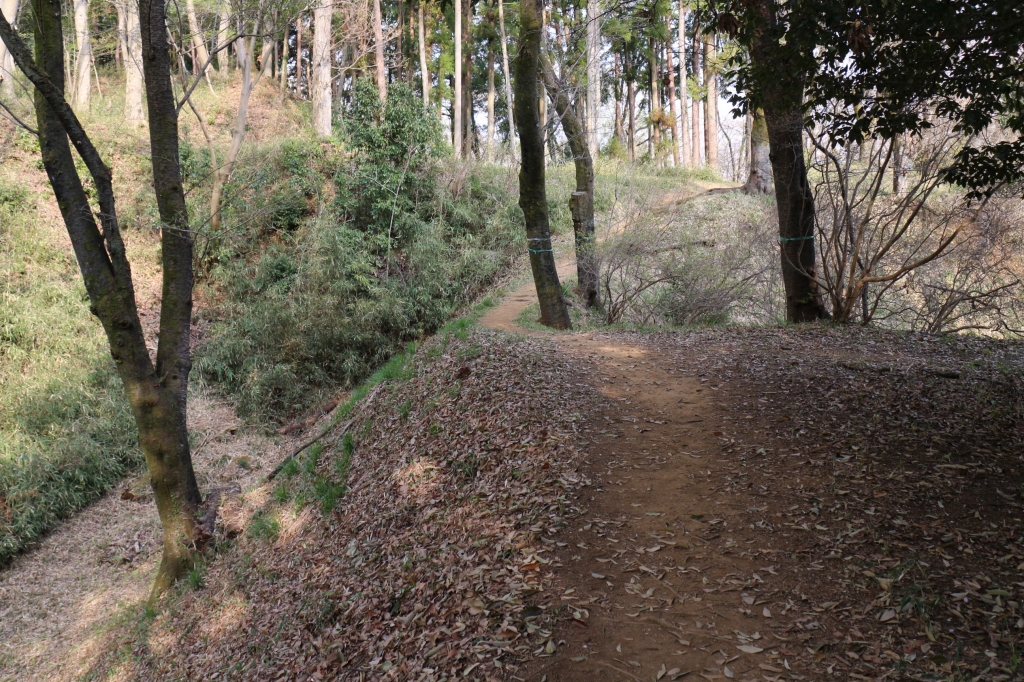 桜の谷を越えると「都立滝山公園」の案内柱があり、いよいよ滝山城址に入る。入口には引橋があり、橋の下は空堀になっており、土塁も見られる。道の北側にはカゾノ屋敷、刑部屋敷、信濃屋敷など重臣たちの屋敷跡があり、南側の下には大池跡がある。