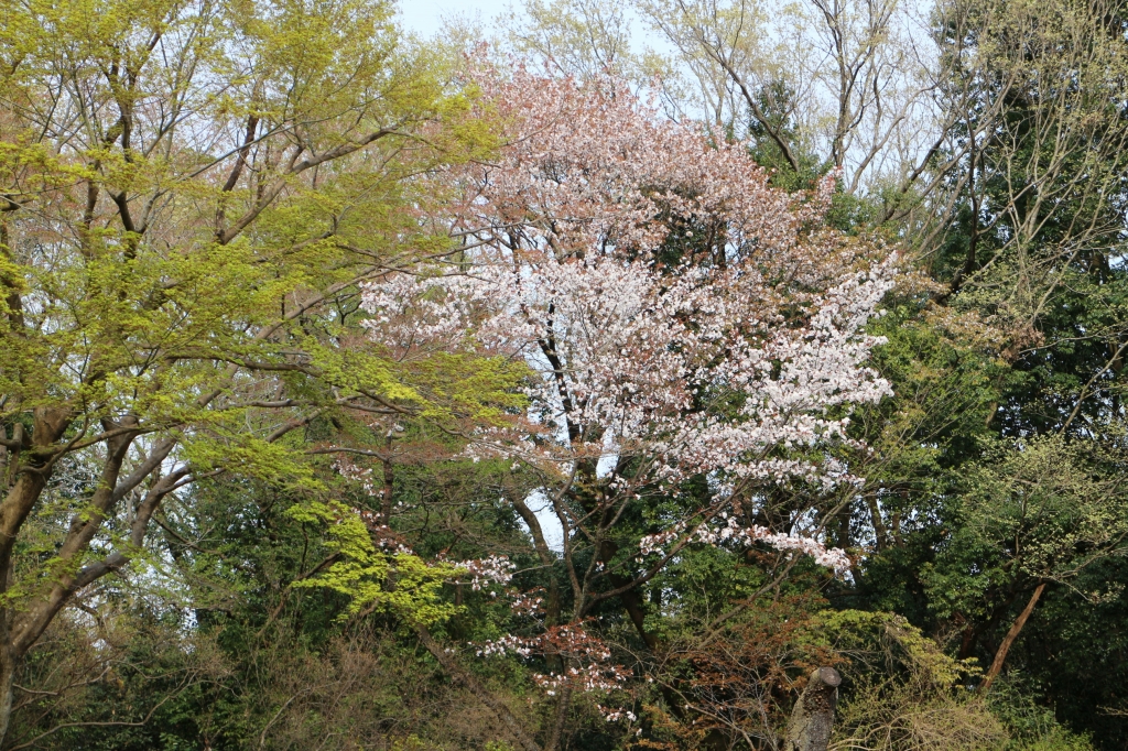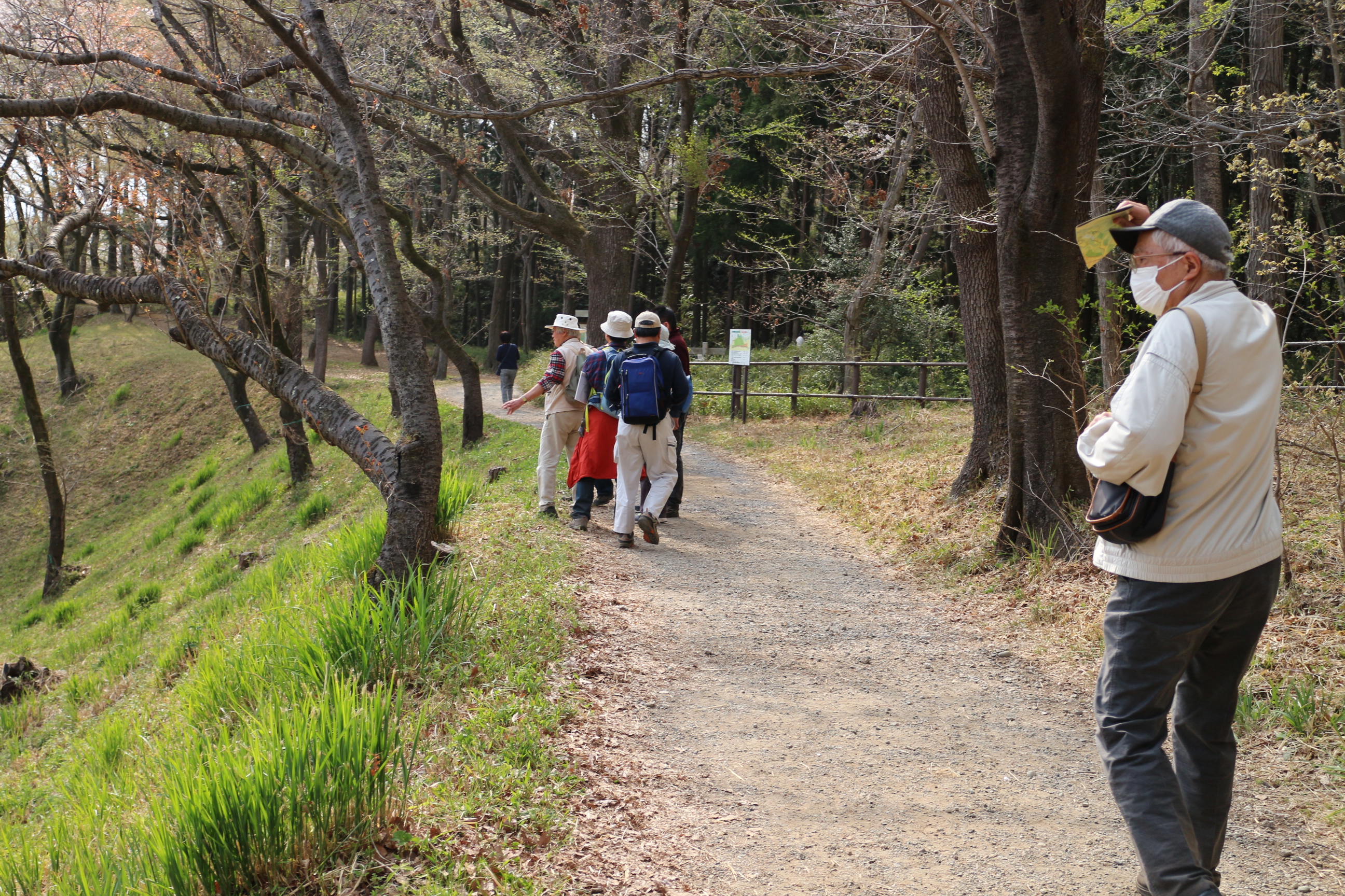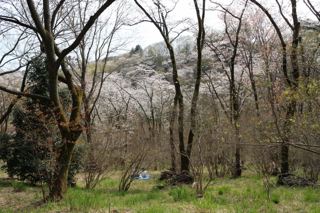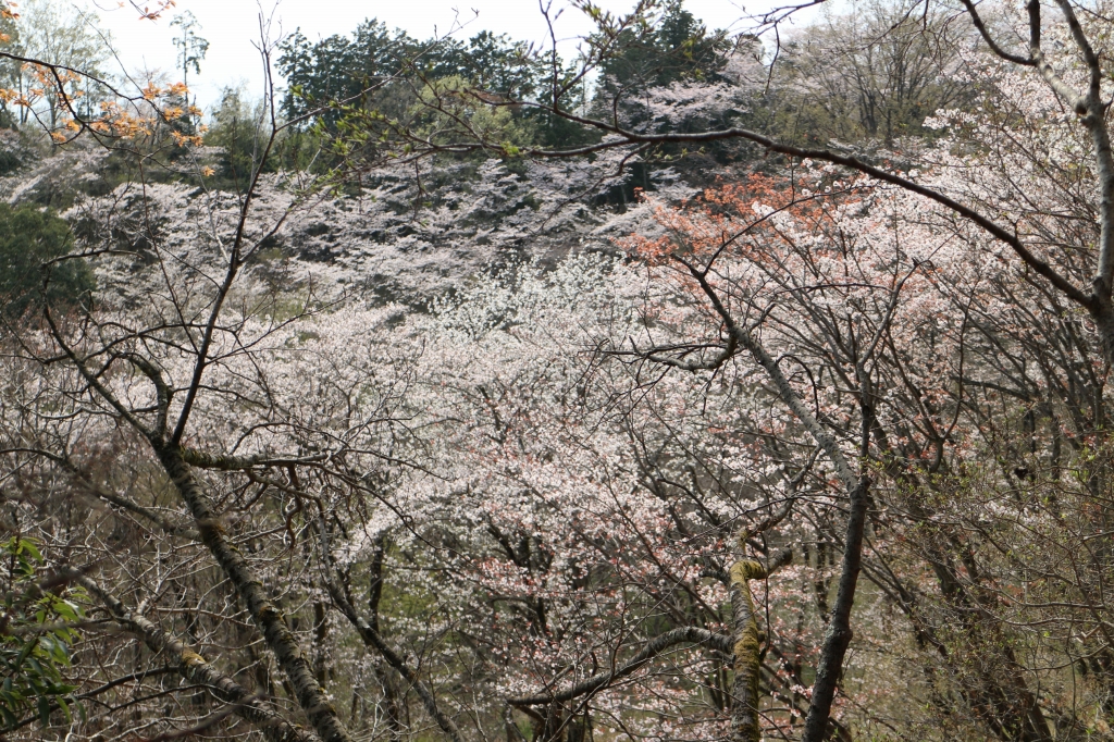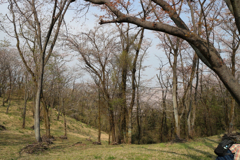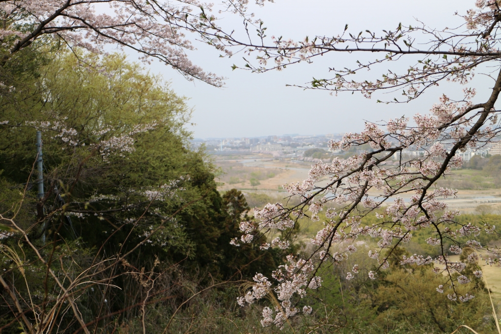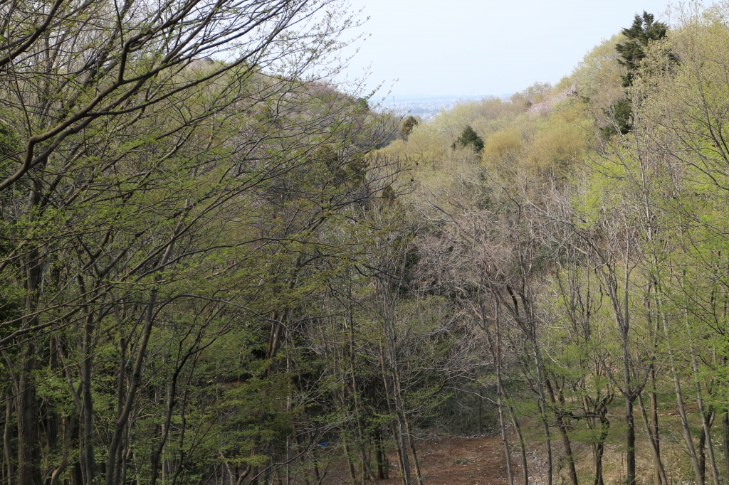 少林寺を出てきた道を尾根まで戻り、再び尾根道を西に向かう。この辺りが古峯ヶ原(こぶがはら)と呼ばれる地域で、桜の新緑に朱色の山ツツジが映えて美しい。山ツツジの尾根道が切れた南側には遠くに丹沢の山を望み、近くの丘陵の中には創価大学の白い建物が目につく。更に尾根道を進むと桜が群生する緩やかな谷あり、その道沿いに根元から沢山の幹が分岐している桜が目につく。幹の一本に「九本桜」と書かれた札が付けられていた。数えると確かに幹が9本あった。