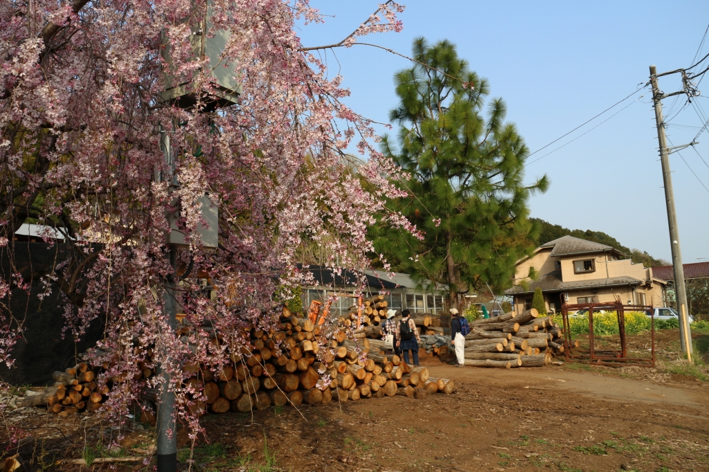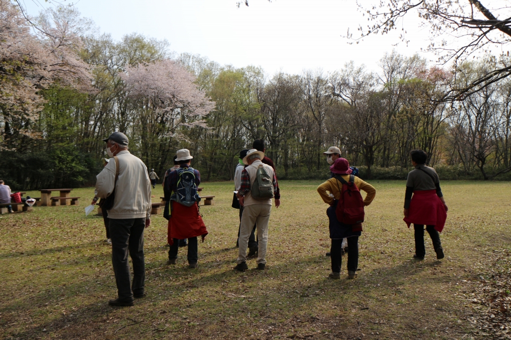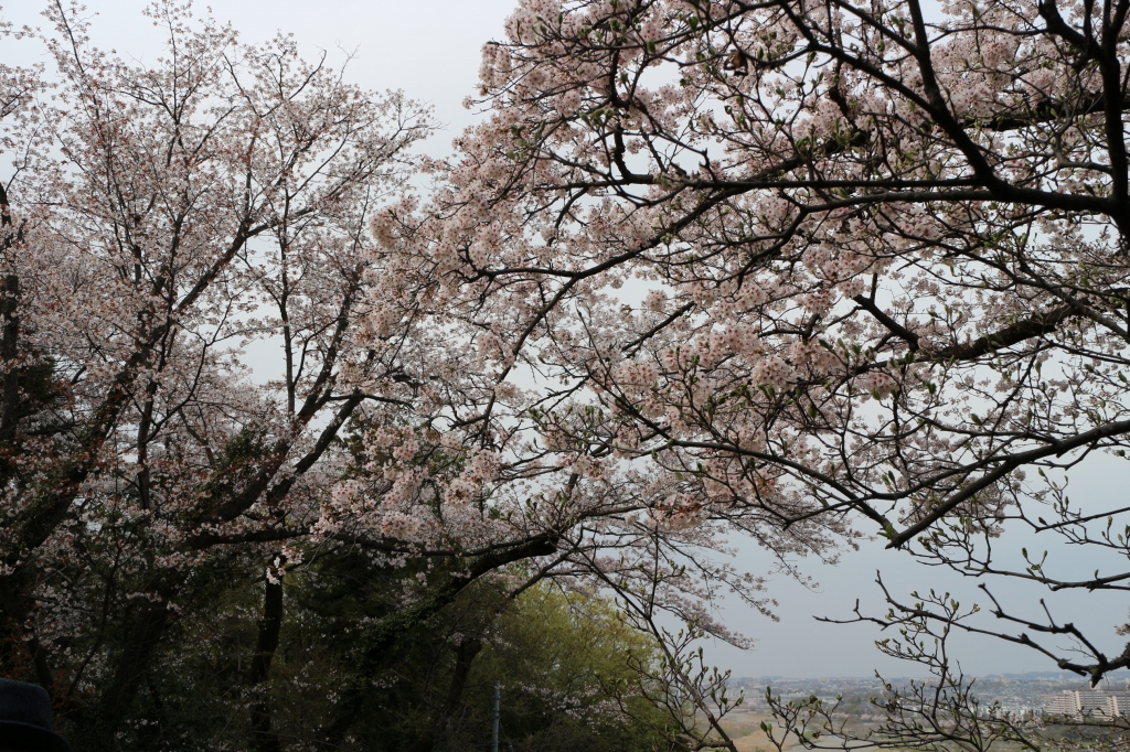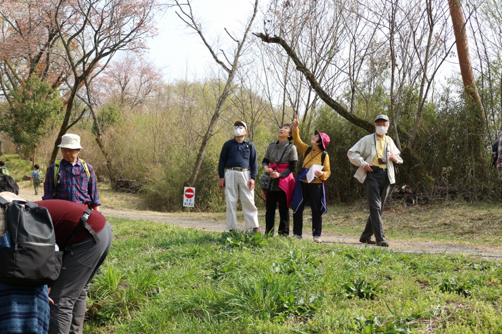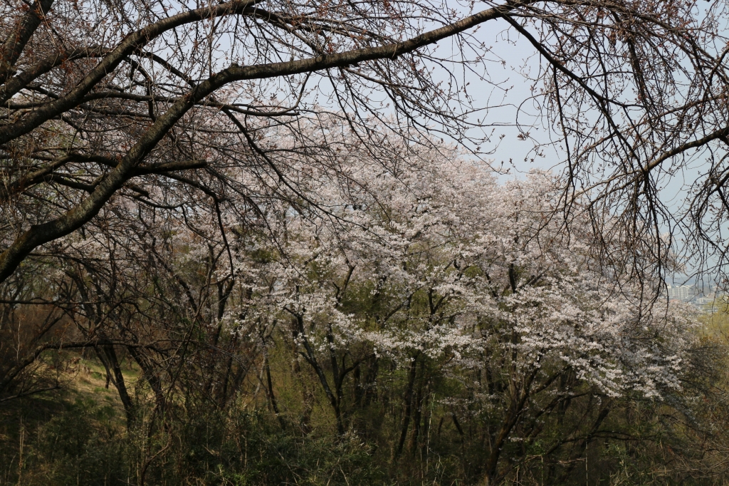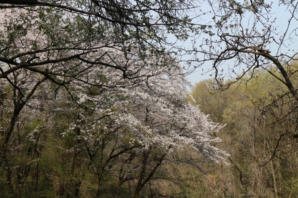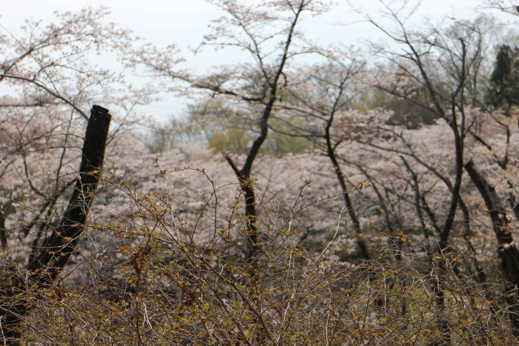 少林寺を出てきた道を尾根まで戻り、再び尾根道を西に向かう。この辺りが古峯ヶ原(こぶがはら)と呼ばれる地域で、桜の新緑に朱色の山ツツジが映えて美しい。山ツツジの尾根道が切れた南側には遠くに丹沢の山を望み、近くの丘陵の中には創価大学の白い建物が目につく。更に尾根道を進むと桜が群生する緩やかな谷あり、その道沿いに根元から沢山の幹が分岐している桜が目につく。幹の一本に「九本桜」と書かれた札が付けられていた。数えると確かに幹が9本あった。