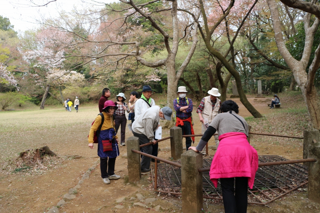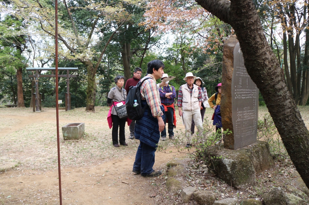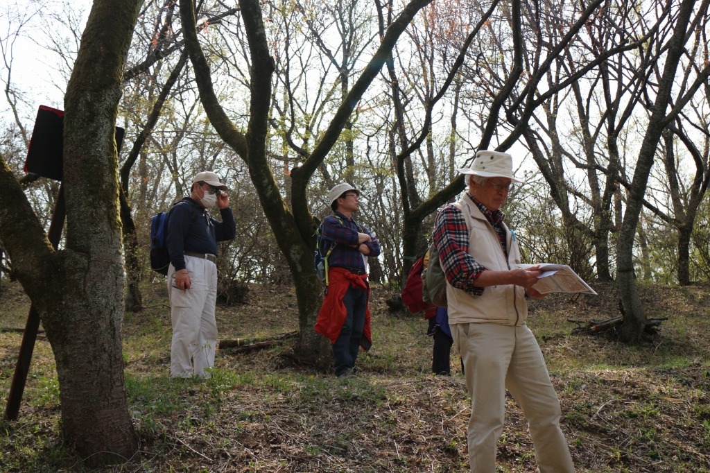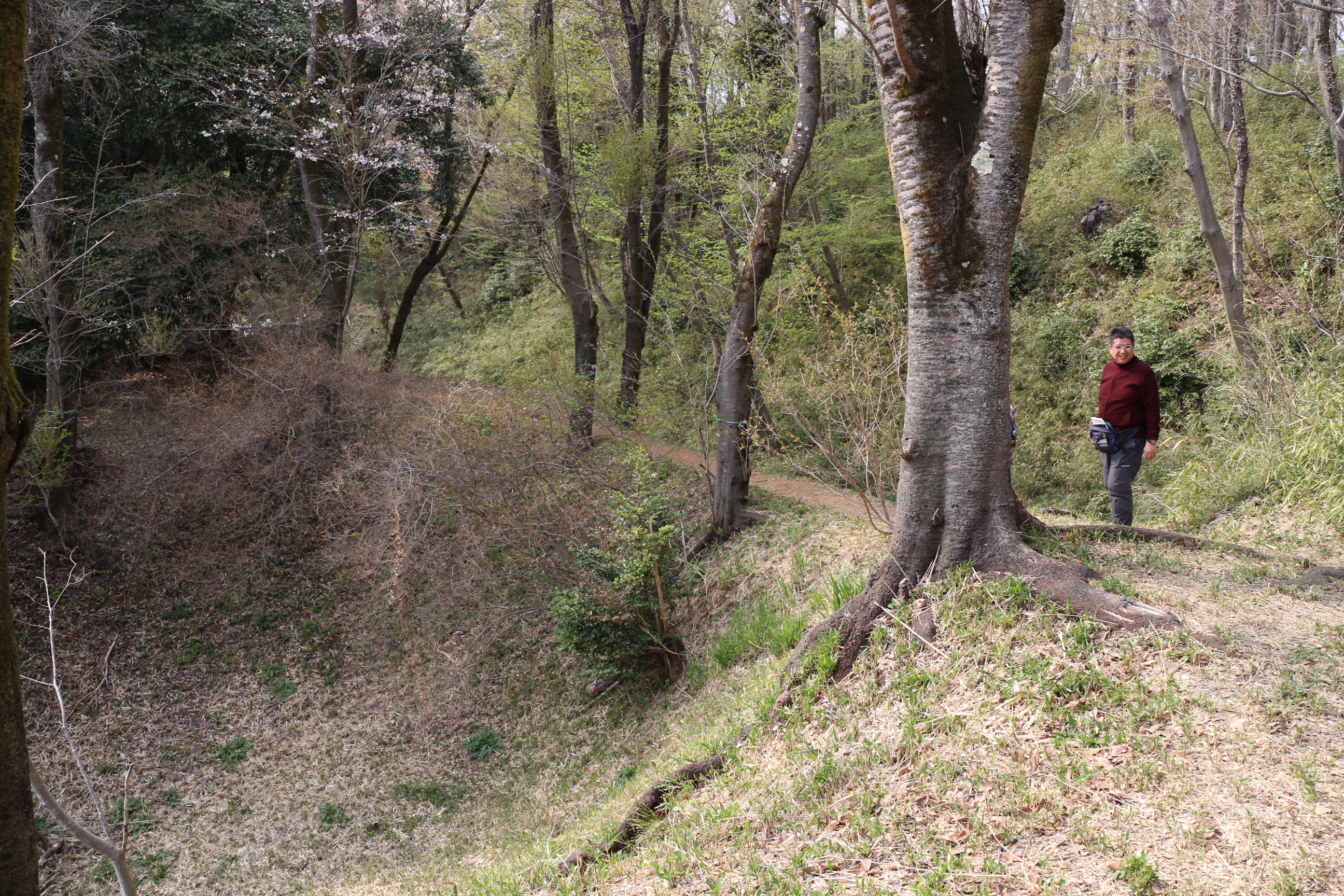 この展望所のところで、今回参加メンバーで記念撮影をし、来た道を二の丸まで戻る。途中、改めて引橋、や空堀、土塁などの遺構を確認する。