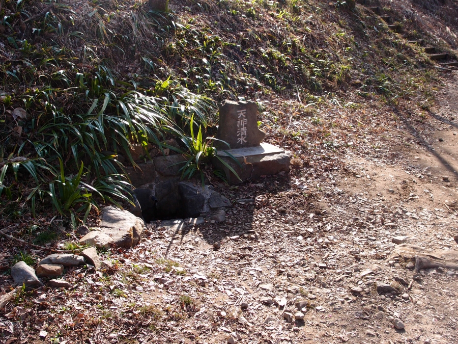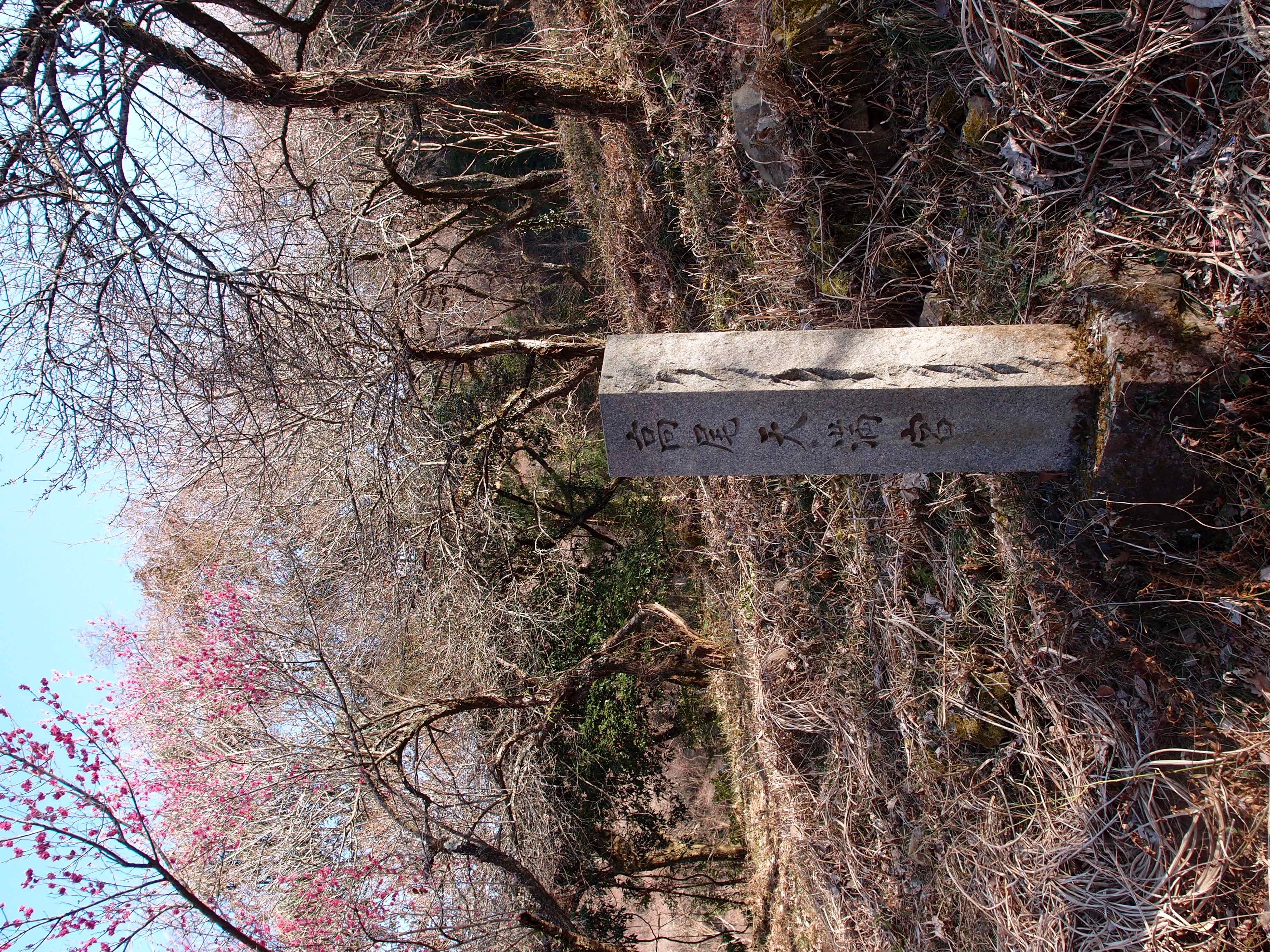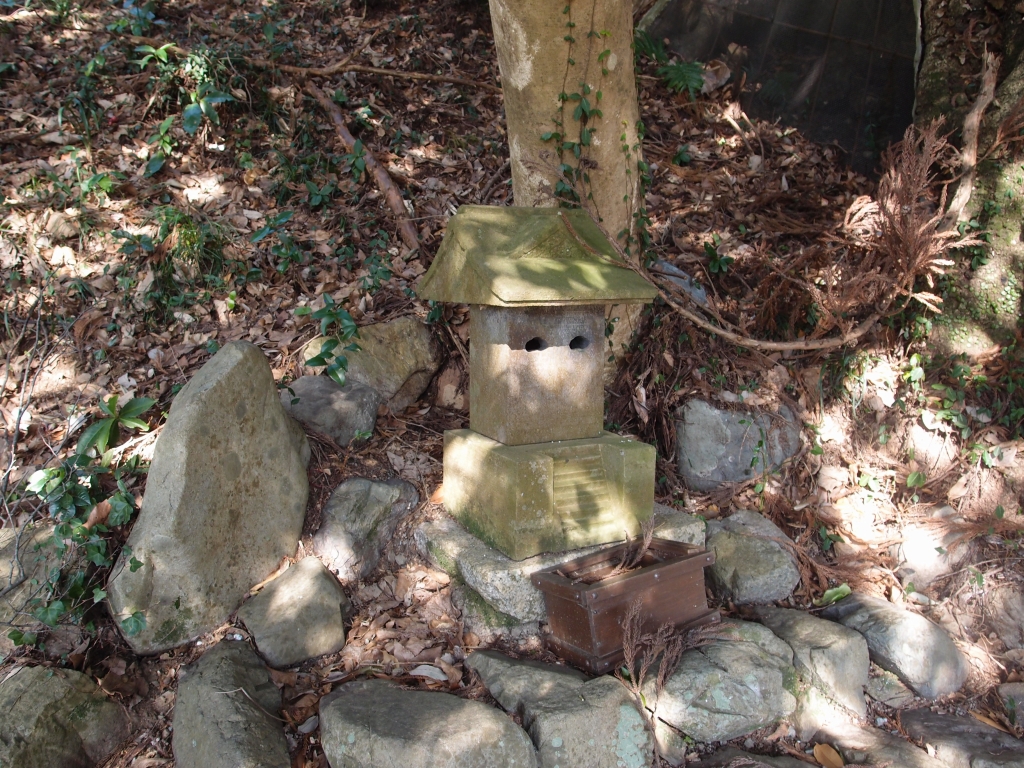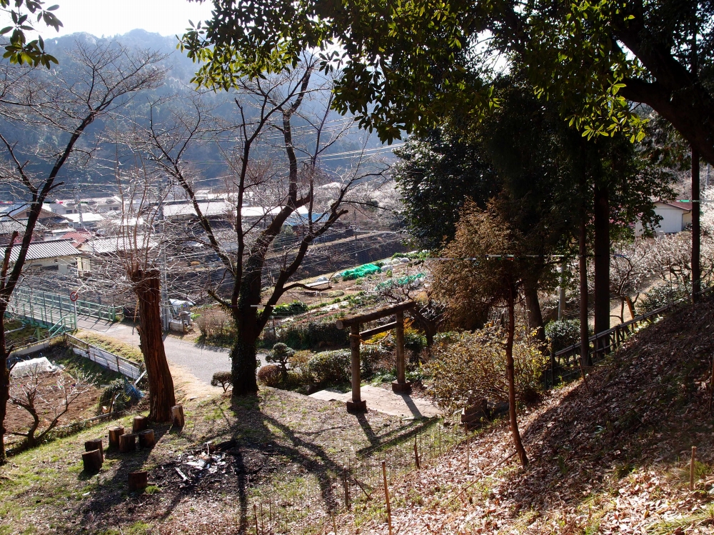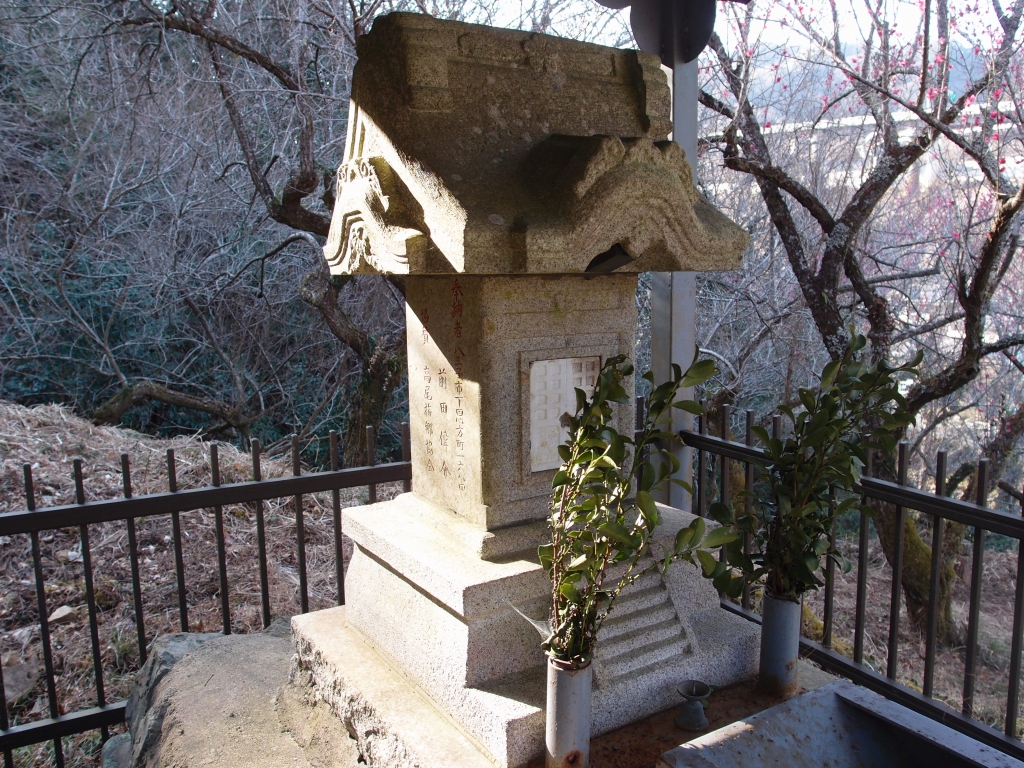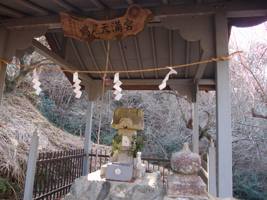 小仏川沿いの山裾の道から梅林に向かう道に架かる橋を渡った山麓に「高尾天満宮」の碑があり、梅林の斜面を少し登ったところに小さな石の祠がある。