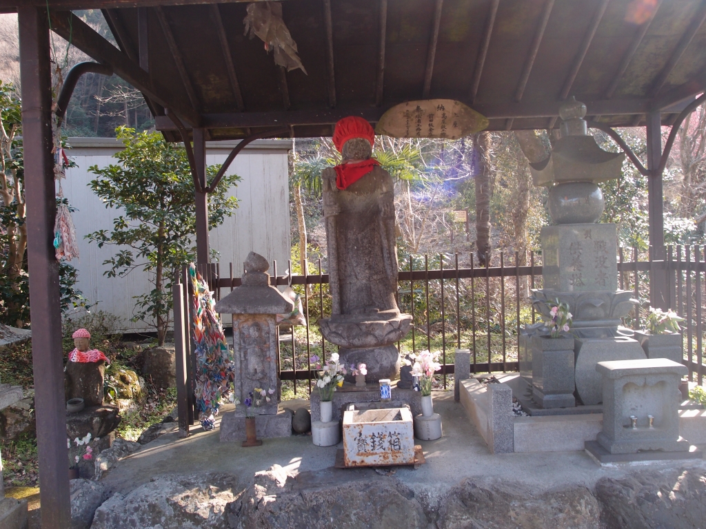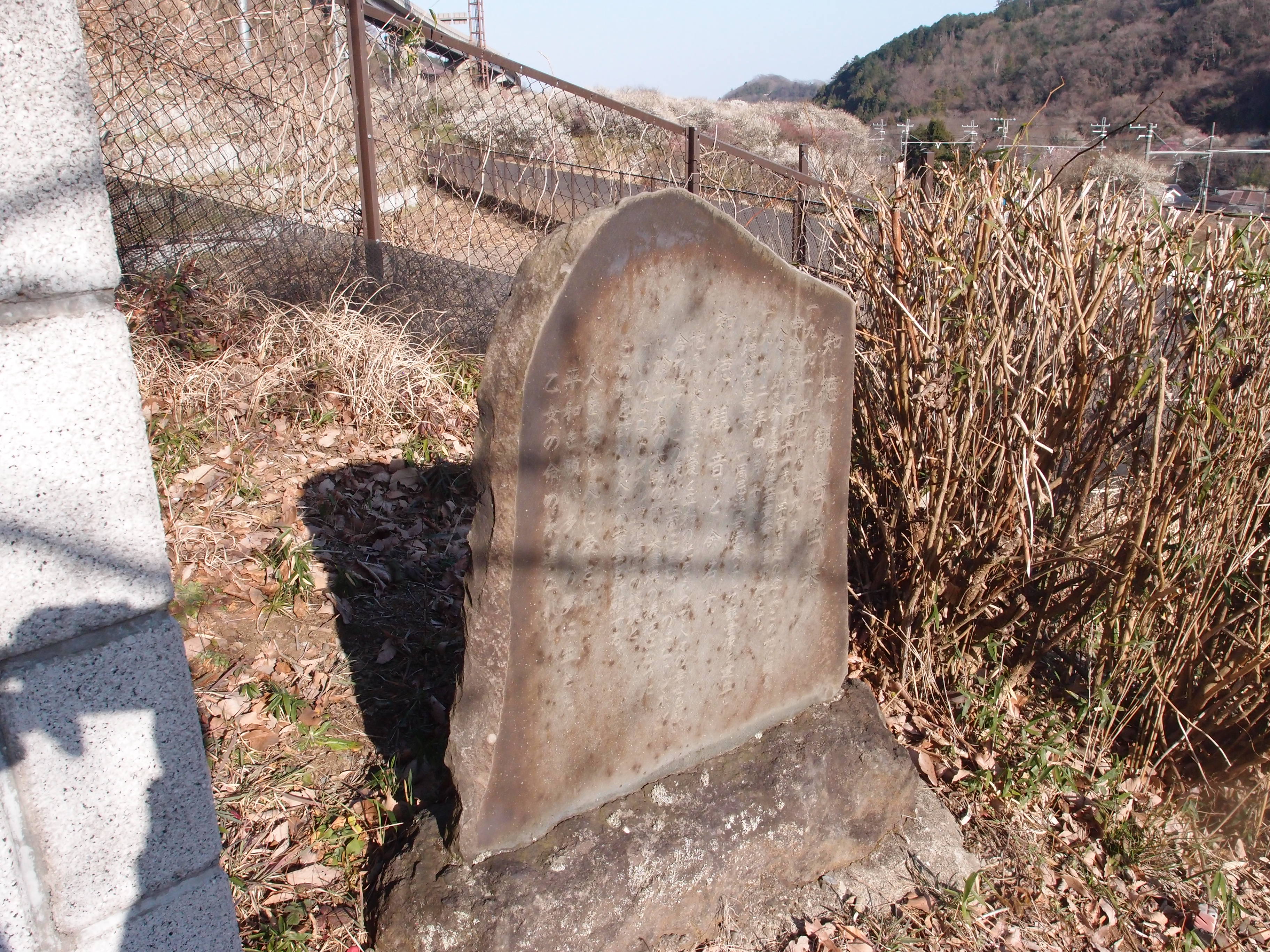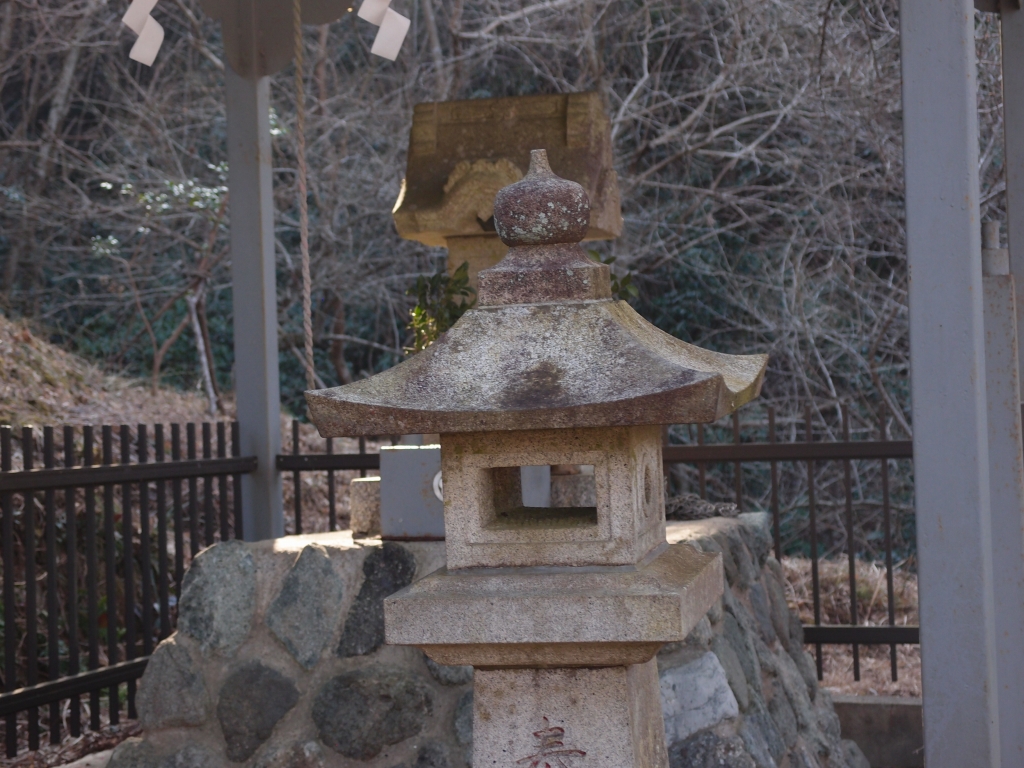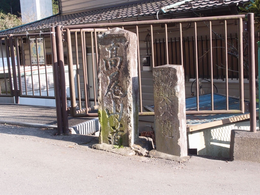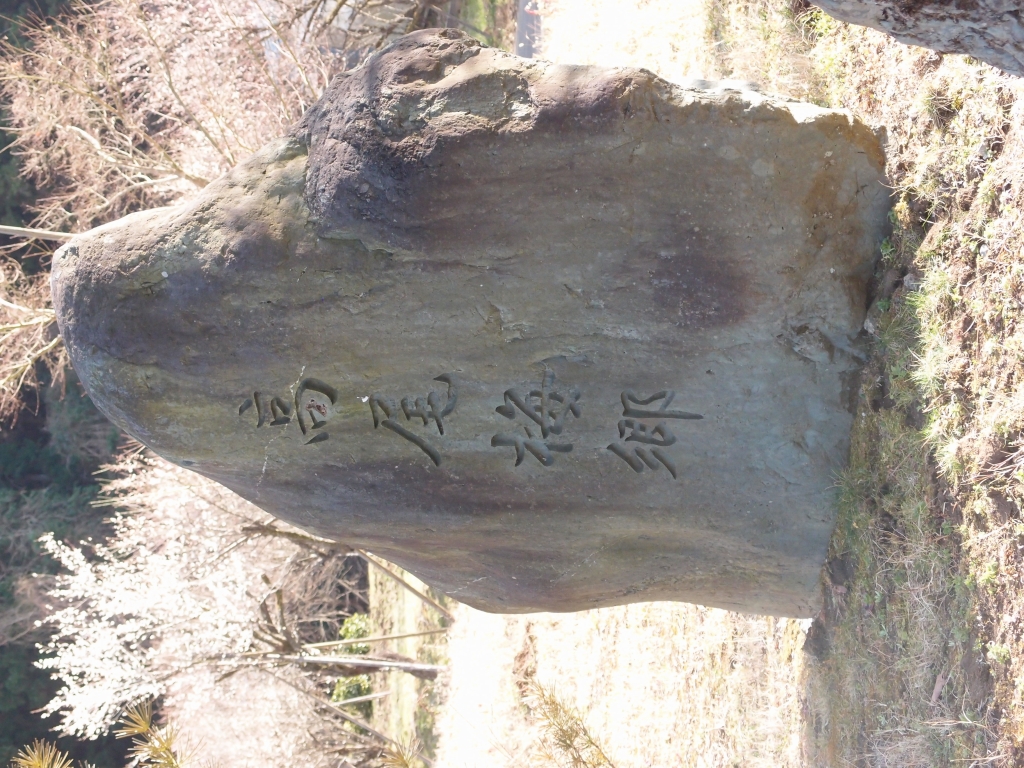 小仏川沿いの山裾の道から梅林に向かう道に架かる橋を渡った山麓に「高尾天満宮」の碑があり、梅林の斜面を少し登ったところに小さな石の祠がある。