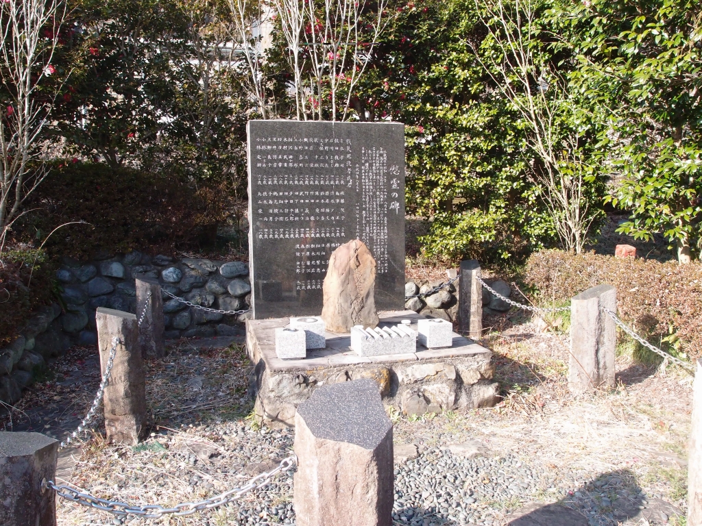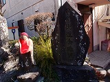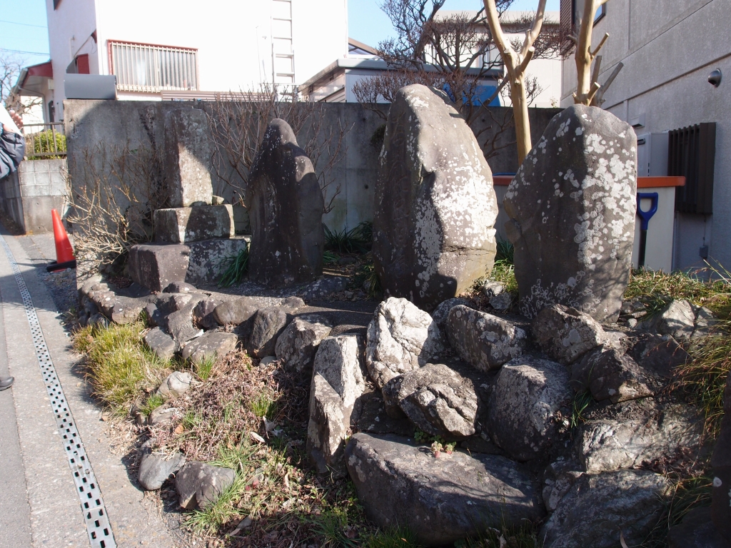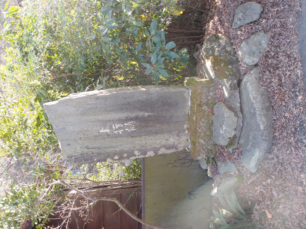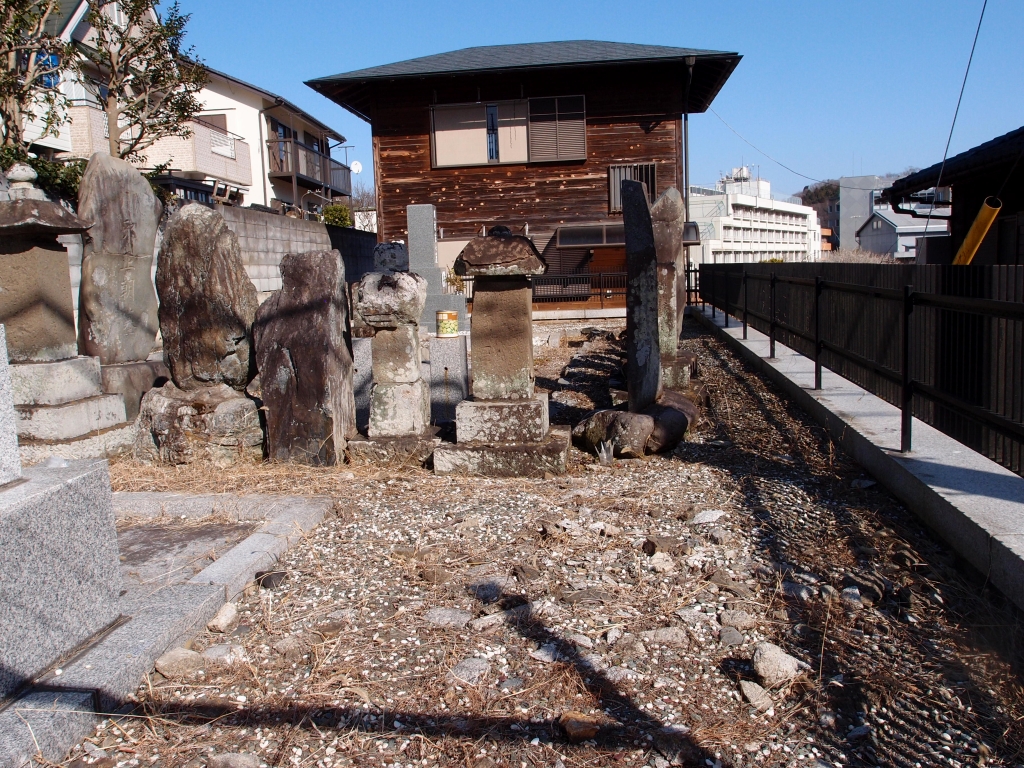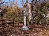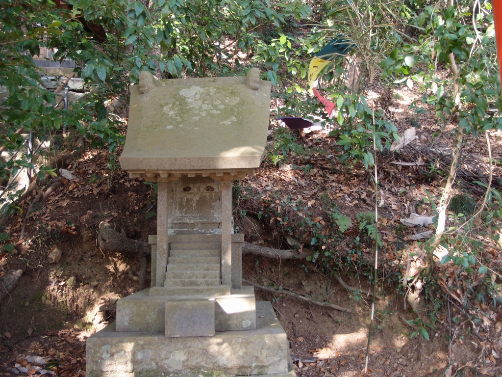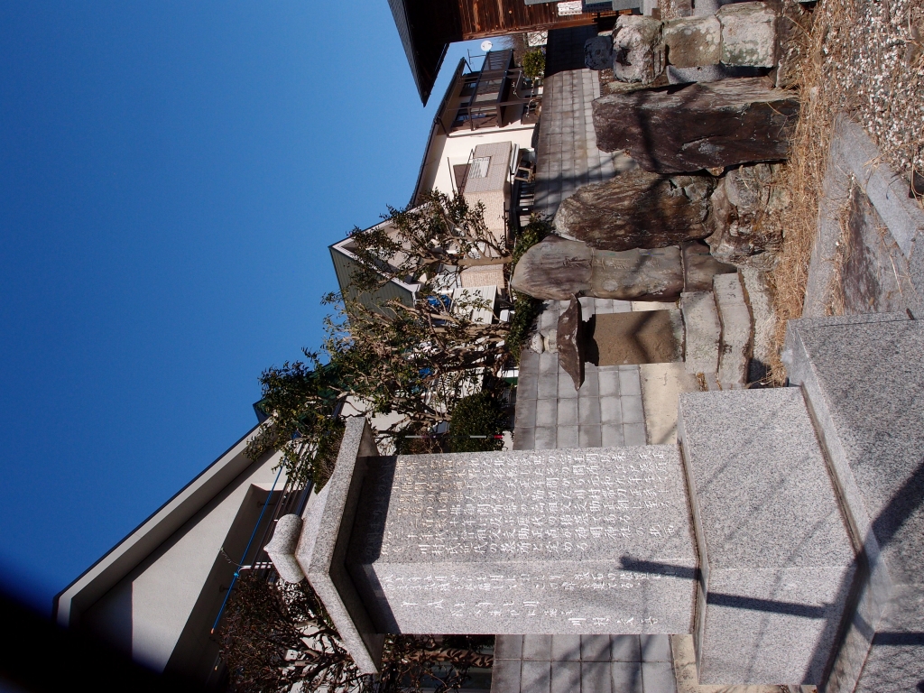 小仏川沿いの山裾の道から梅林に向かう道に架かる橋を渡った山麓に「高尾天満宮」の碑があり、梅林の斜面を少し登ったところに小さな石の祠がある。
