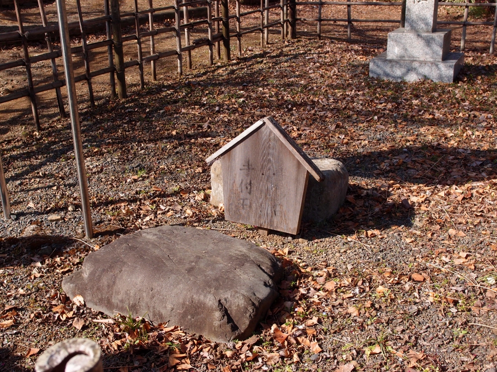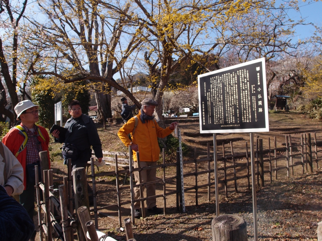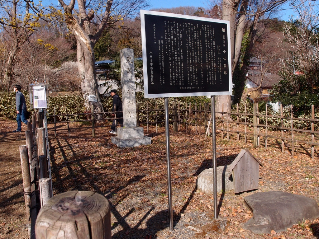 竹垣の外には、小仏の関の様子を描いた江戸時代の絵図の説明版があり、西側道路際の一段高いところには、「駒木野宿跡」と書かれた大きな碑が建っている。これにより関所跡の建物などは竹垣の西側にあったことが分かる。