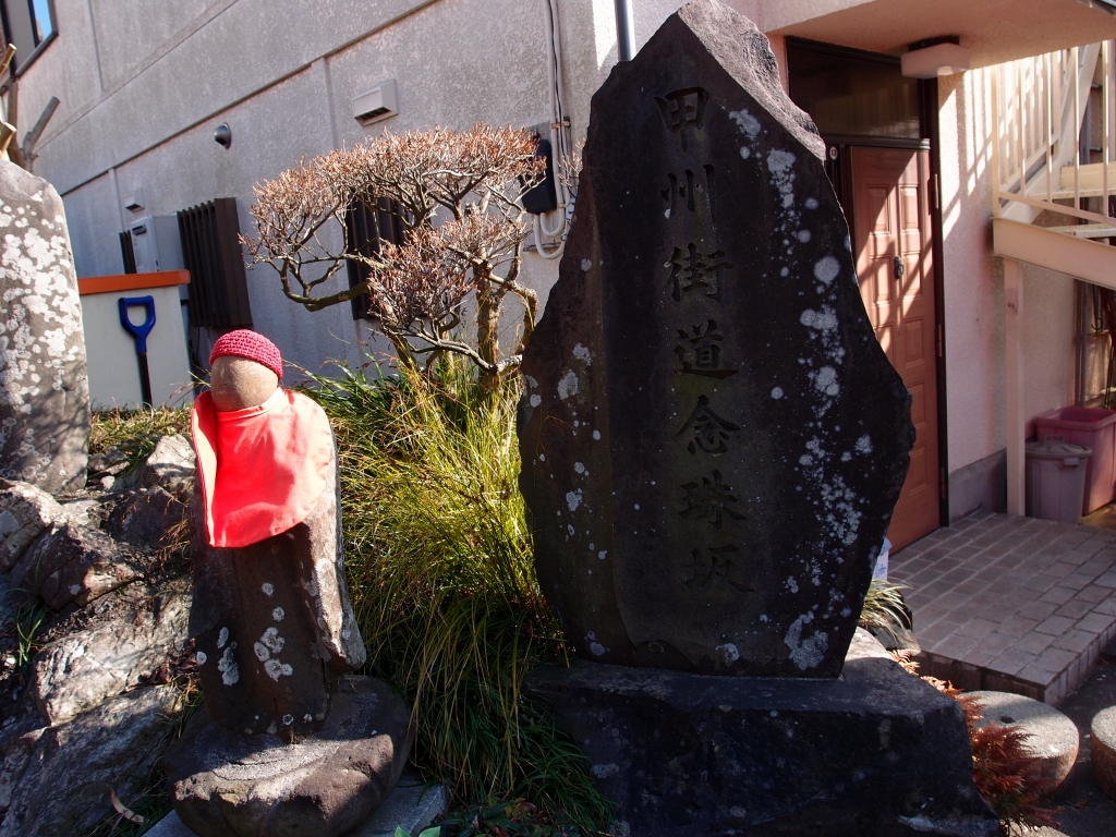 小仏関から西に向かう下り坂が新編武蔵国風土記稿に「街道の内ニシテ駒木野ニアリ」と記載された「年中坂」である。道の南側に石碑や地蔵が並び、最西端の碑には「念珠坂」の文字が刻まれている。