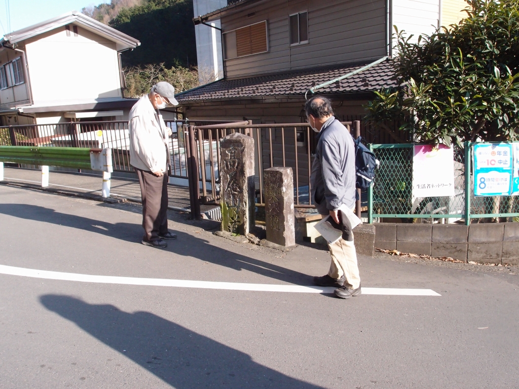 旧甲州街道の北川に竹垣に囲まれて「小仏関跡」の碑が立っている。手前の説明版の横には手形石、手付石と説明のある台状の四角い石が並んでいる。「手形石」は通行証である手形を置き、「手付石」に手をついて通行の許可を待ったという。