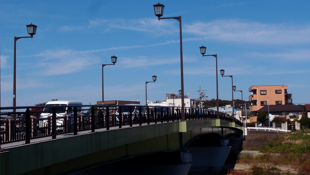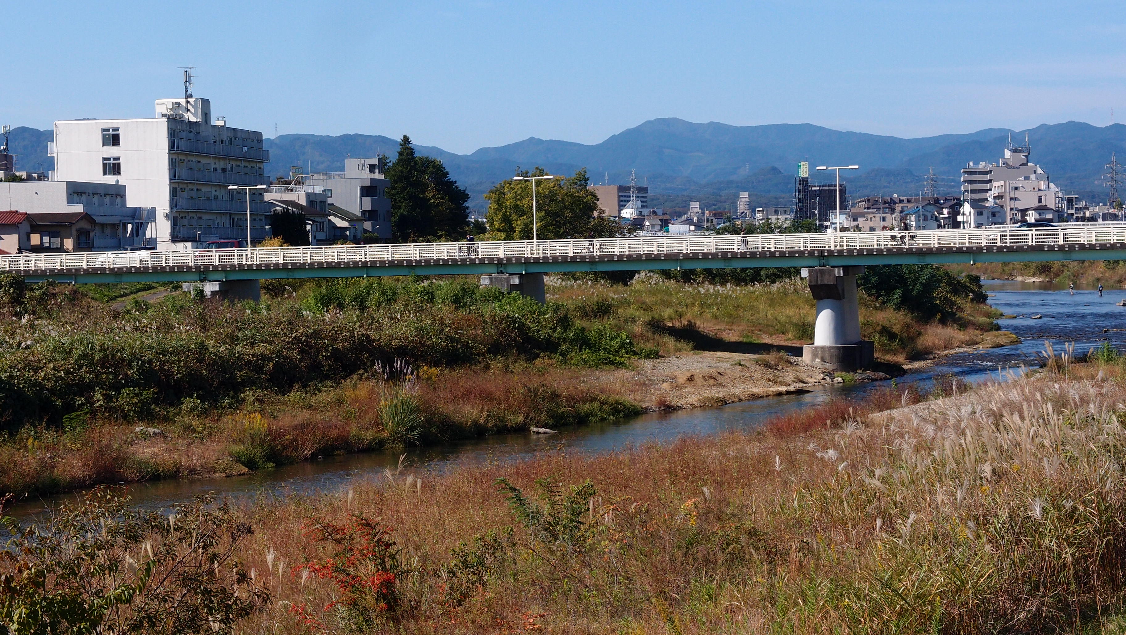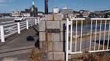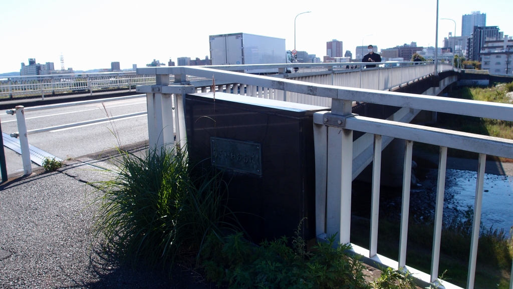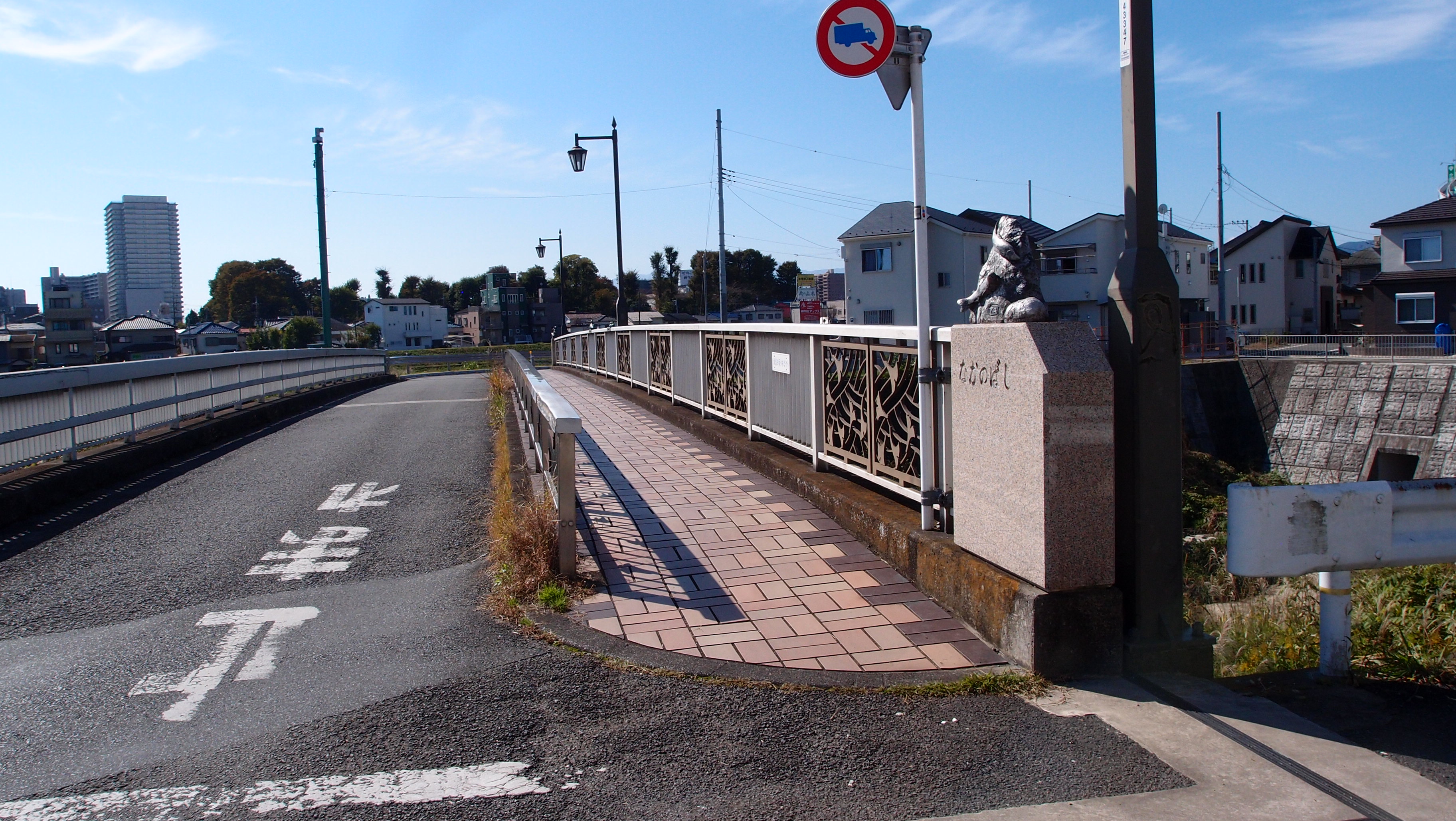 1983年に竣工した浅川の最上流に架かる全長160m、川幅14.2mの橋。橋の袂には八王子市役所があり、橋の欄干には八王子に所縁のある彫刻像が乗っている。