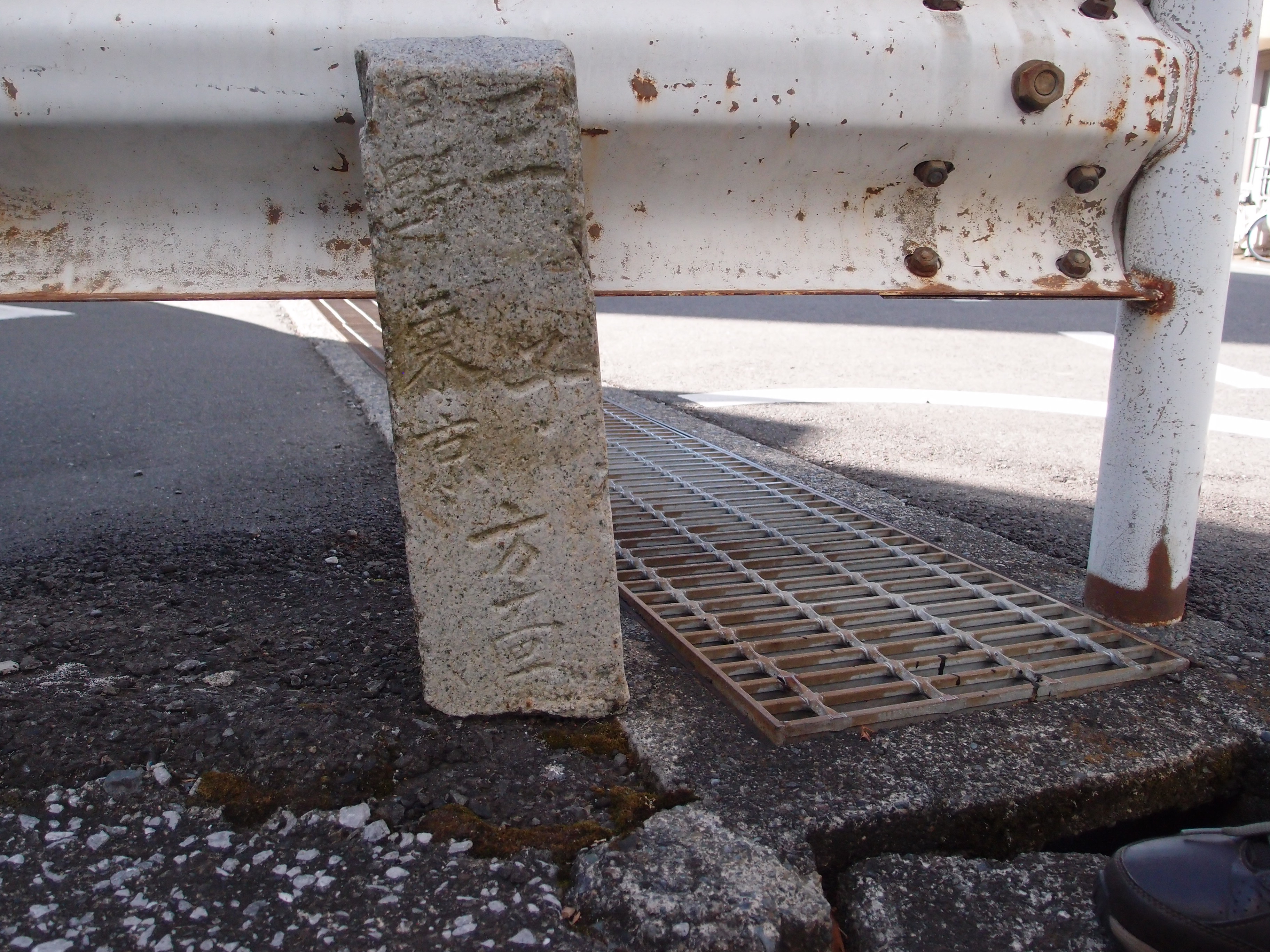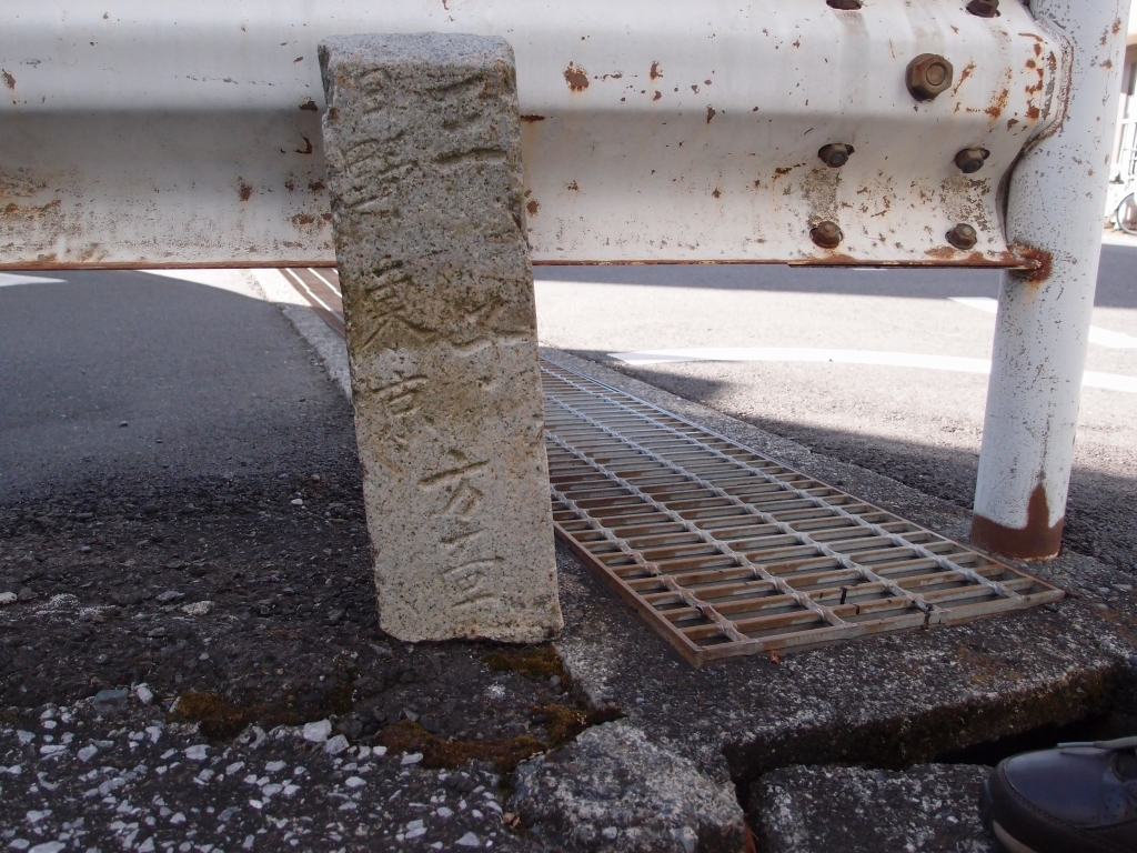 大和田中央会館から西に 150m ほど、大和田橋北から旧甲州街道を東に進んだ分岐点のガードレールの下にほとんど埋もれて、頭だけが残る道標がある。一見しただけでは道標と気づかないが、よく見ると四角い柱状の石には(東)刻字なし、(北)「村青」、(西)「王
