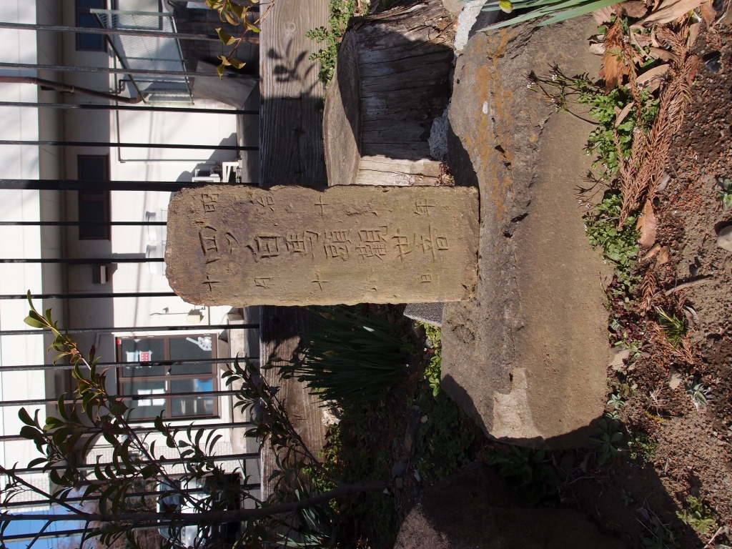 3基の石像物で最も大きなのに、『高幡山不』と大きく彫られた文字が読み取れる。元は甲州街道の南側、八王子往還の日野市の高幡不動へ通じる道の分岐点にあったという。