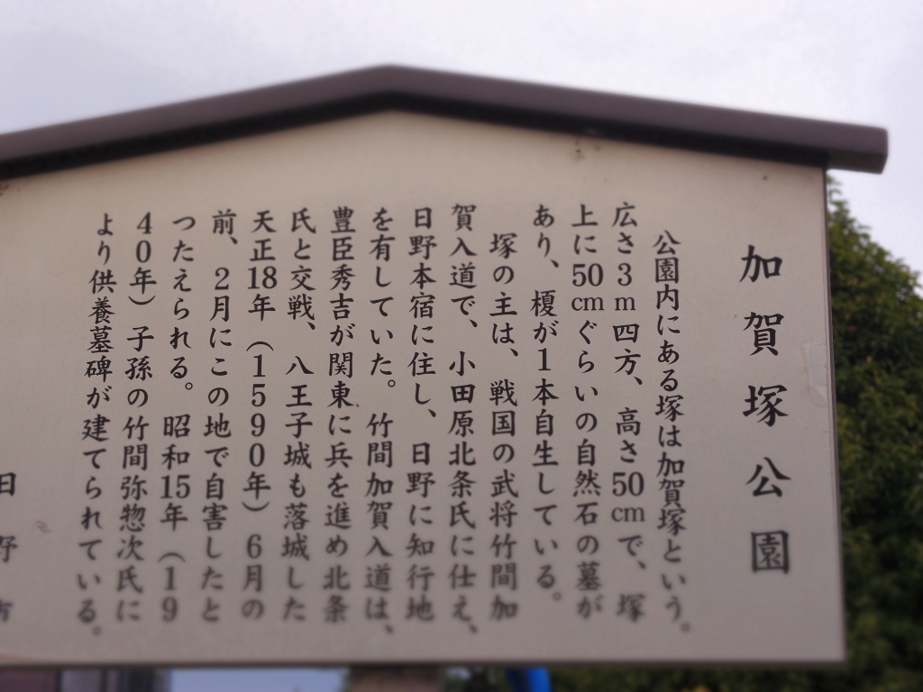 竹間加賀入道は、滝山城主北条氏照に仕え、鉢形城の守備にもあたった武将で、天正14(1586)年に氏照が日野の竹木伐採を禁じた文書の中に名前がある。