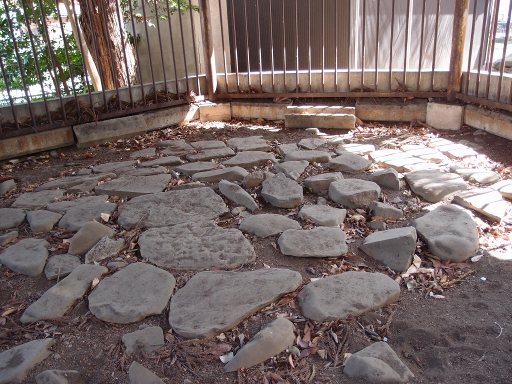 神社の敷地裏側に由比第一小学校で発掘された市指定文化財の敷石住居跡(縄文後期)が移設されている。