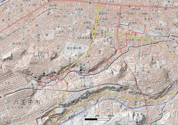 明治期の道が残る山田川谷沿いの道を歩く。山田川の源流は現在めじろ台団地ですが、元は南北に別れた谷が入っており、団地ができる前この谷は水田になっていた。山田川はめじろ台から八王子駅南部に続く台地を刻んで東流しており、この谷沿いには鎌倉・室町時代創建の古い寺院が残っている。
