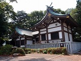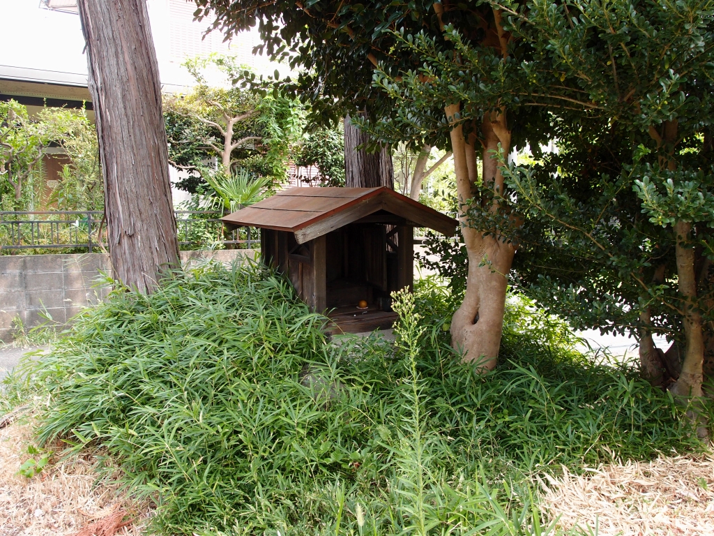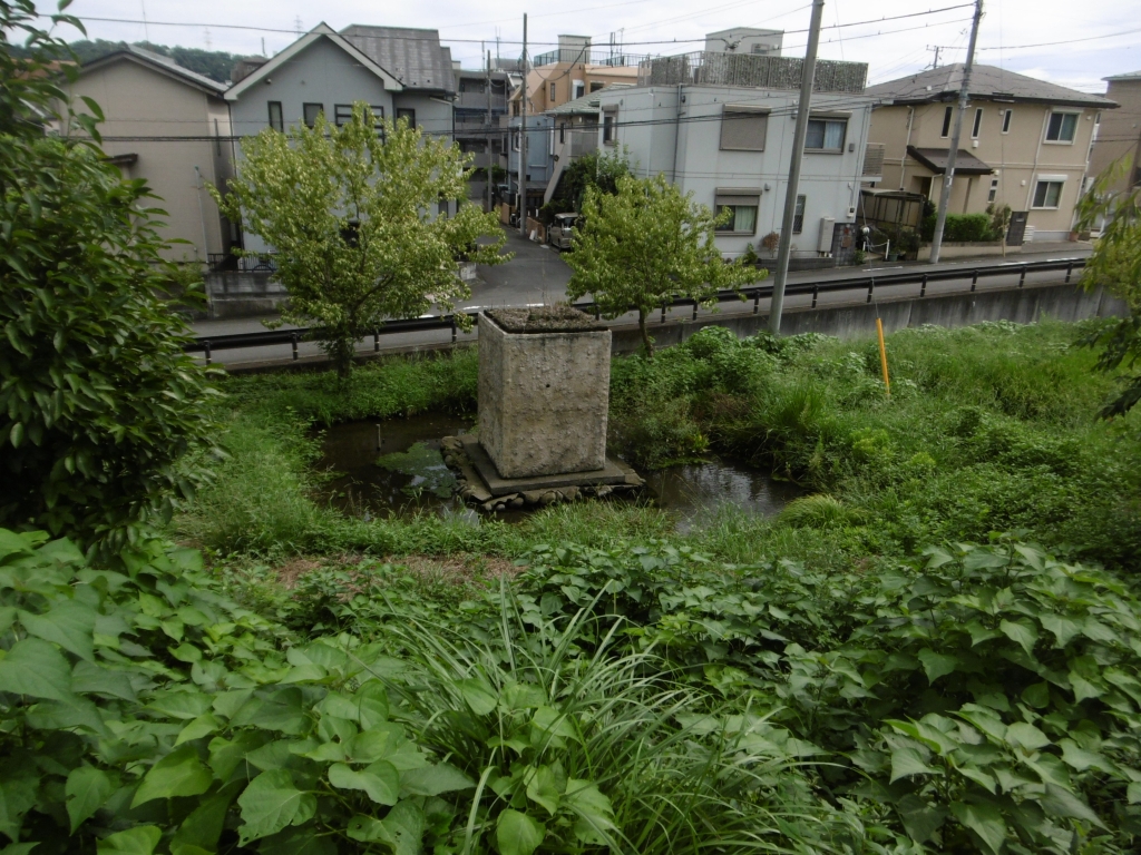 日野市立中央図書館下湧水は日野台地の崖線にある。図書館の裏の庭を突っ切って石段を下りたところに鳥居があり、その脇を湧水が流れている。
