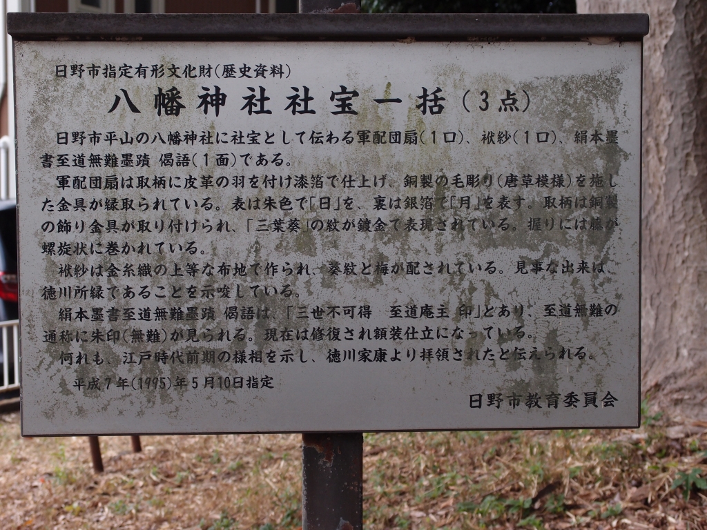 天正18年(1590)、徳川家康が関東へ入国し、領国を巡視した時、この八幡神社の由来を聞き、「軍配団扇」を寄進したと伝えられており、現在この「軍配団扇」はこれを納めていたと思われる「袱紗(ふくさ)」、「至道無難墨蹟(ぼくせき)」と共に同社の社宝となっている。これらの品は「八幡神社社宝(一括3点)」として日野市指定有形文化財に指定されており、毎年9月の第1土曜日と日曜日に開催される祭礼時に一般公開されている。