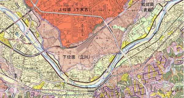 【地形と遺跡】 日野市は日野台と呼ばれる台地が広い面積を占め、南部は浅川による北側が高く南側が低い河岸段丘が発達している。最も高い台地は上位面でその下に下位面があり、更に低位面が認められる。下位面と低位面との境の崖線には湧水が見られる。