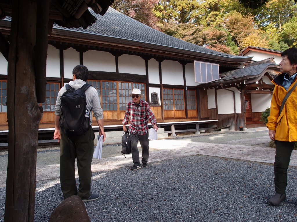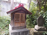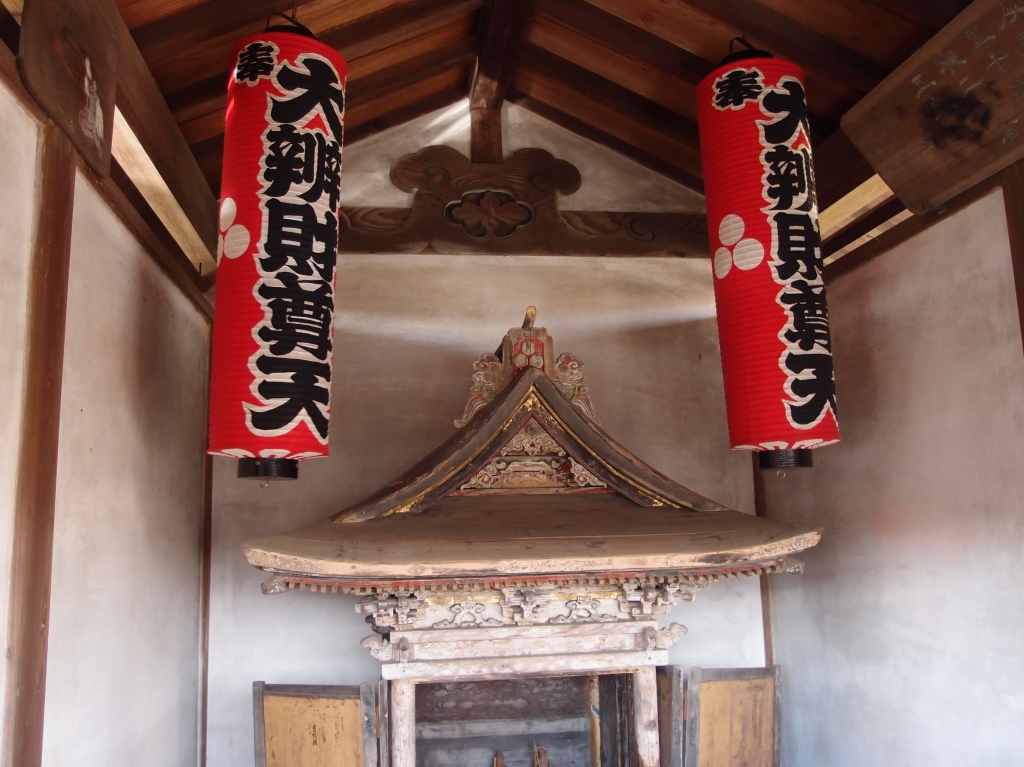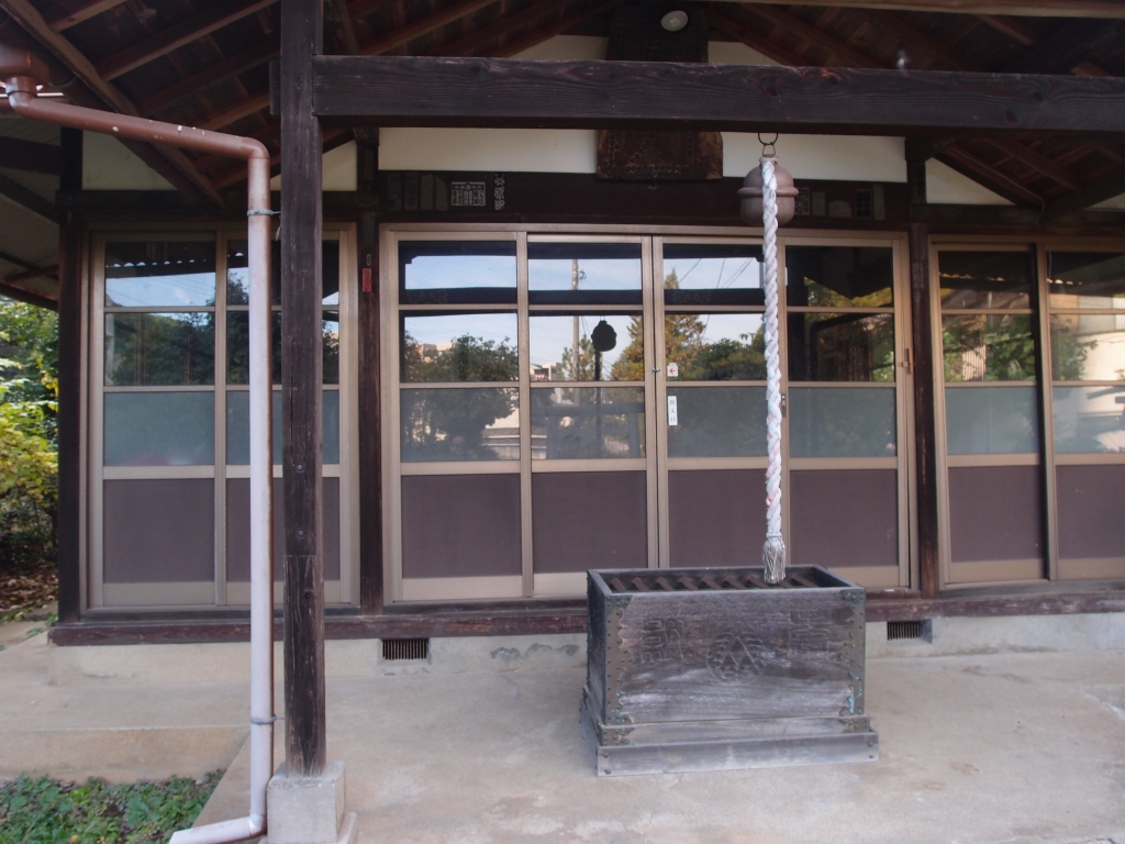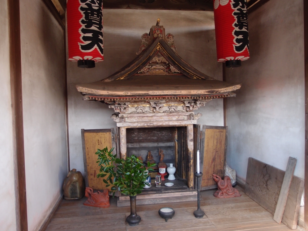 境内を散策していると、神社を守っている当番の方が扉を開けて中を見せてくれた。正面に弁天像が安置され室内も掃除がされて奇麗に保たれていた。話をうかがうと、神社の北側にはかつて3つの池があり、松姫が現在、信松院に保存されている舟を浮かべて遊んだことが伝えられているという。訪れる人と出会うことも少ないということで、帰りに私たち全員にお供えの紙パックのお酒と一ひねりの塩をいただいた。