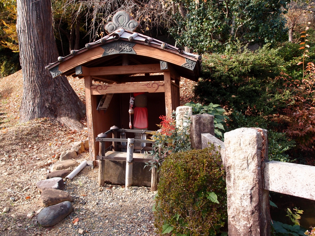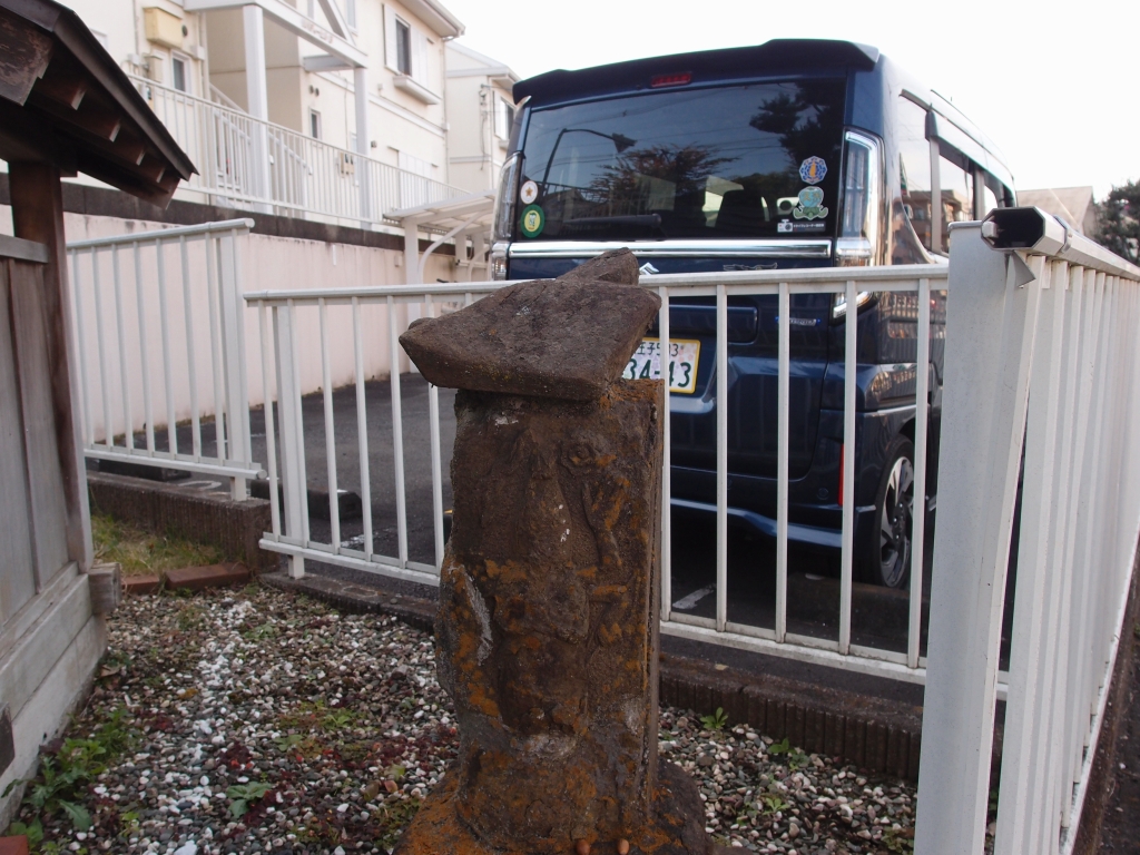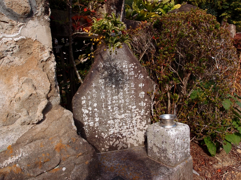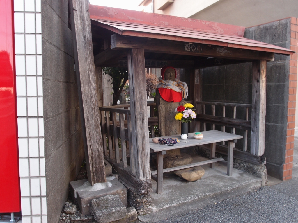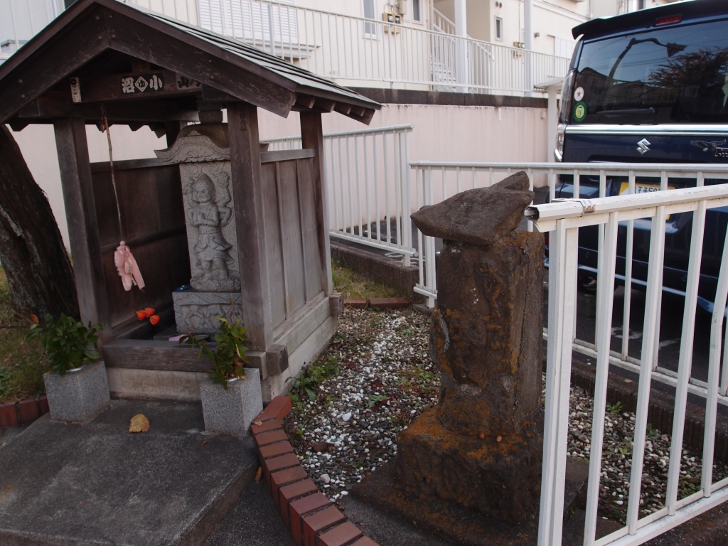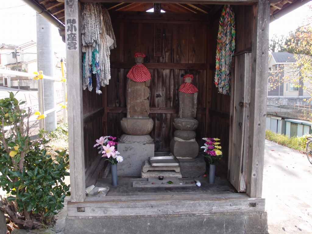 共に古道の都道506号線と市道243の交差点近くの月見橋の袂には地蔵尊が祀られている。