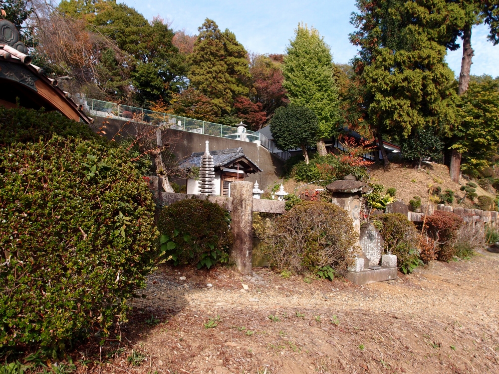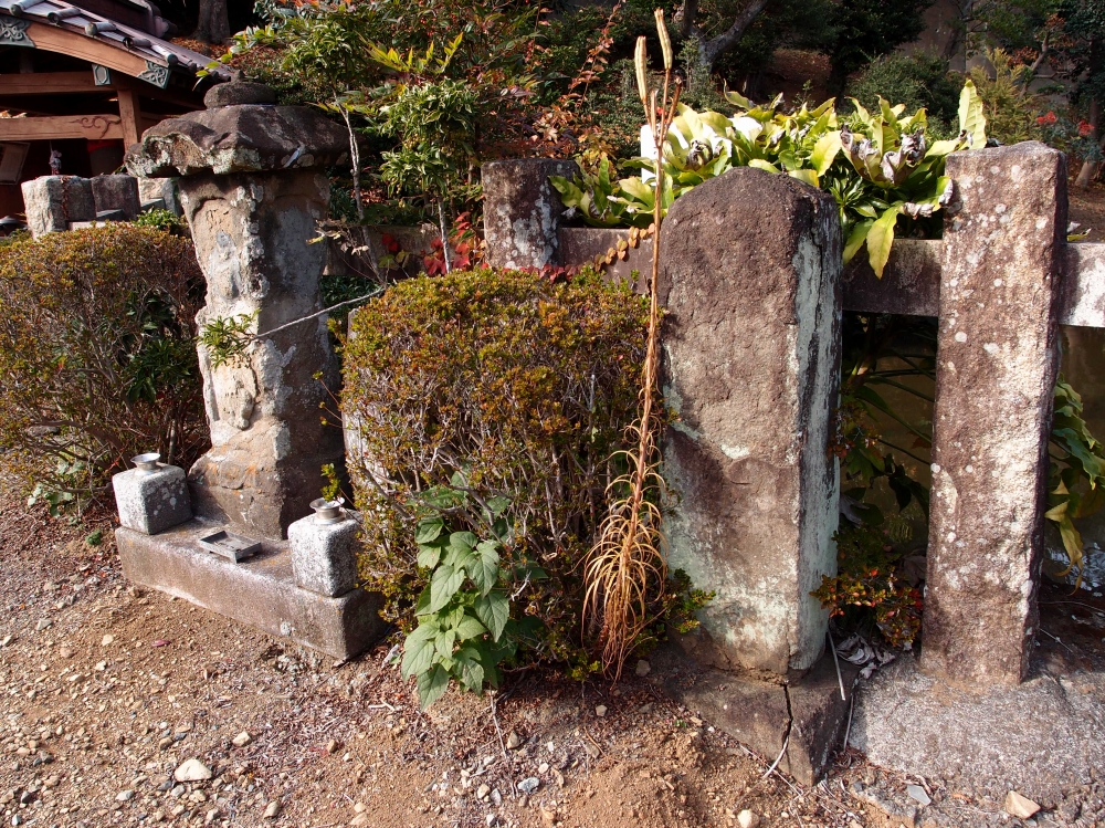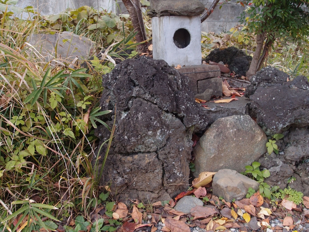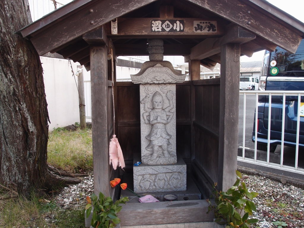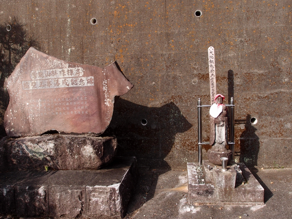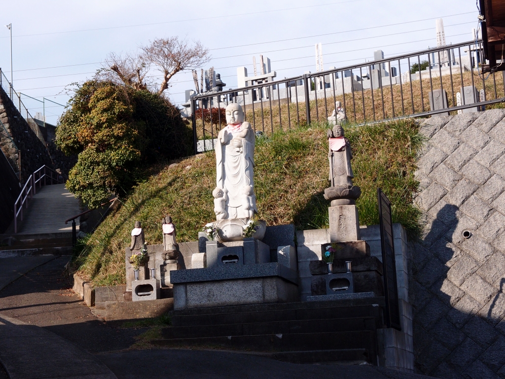 共に古道の都道506号線と市道243の交差点近くの月見橋の袂には地蔵尊が祀られている。